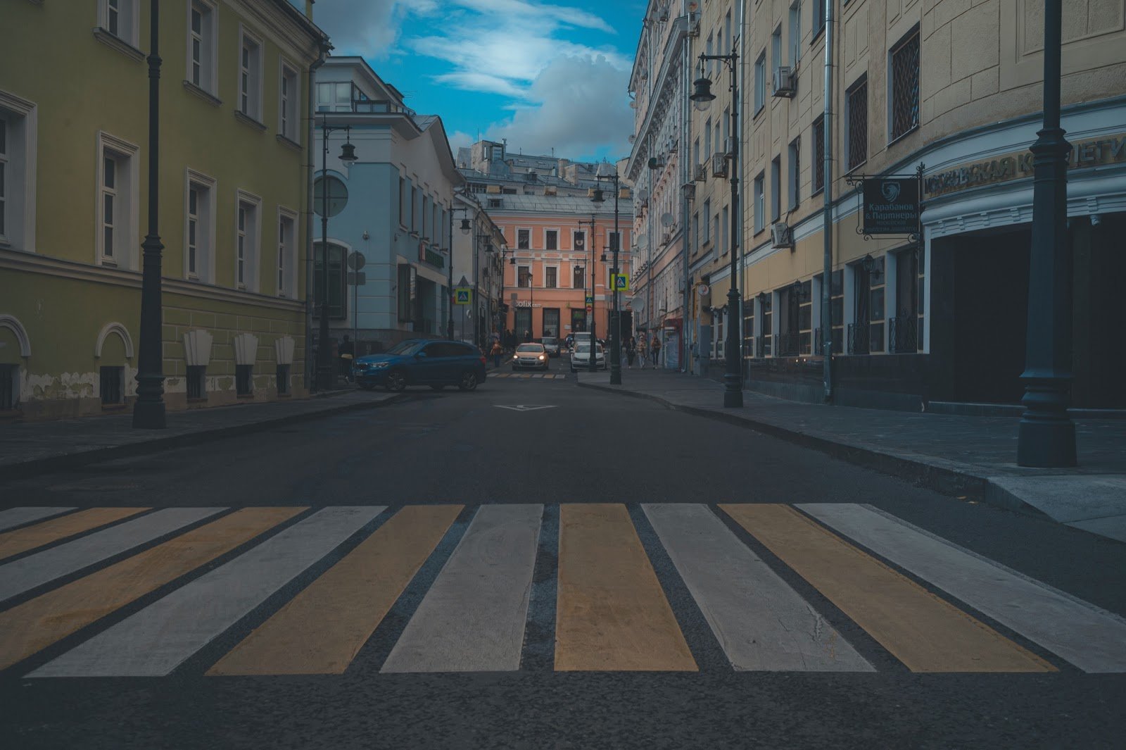 Тифлокомментарий: цветная фотография безлюдной городской улицы. Уходящая вдаль проезжая часть ограничена с обеих сторон узкими тротуарами и невысокими строениями в неоклассическом стиле. На переднем плане — нерегулируемый пешеходный переход, обозначенный дорожной разметкой: широкими поперечными полосами желтого и белого цвета.