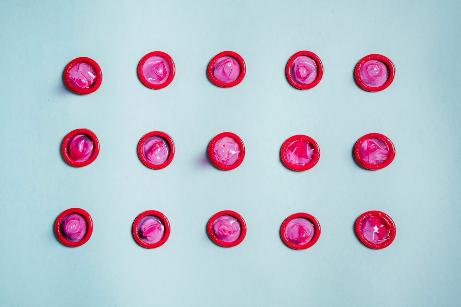 Тифлокомментарий: цветная фотография. На голубом фоне в три ряда расположены 15 презервативов розового цвета без упаковки.