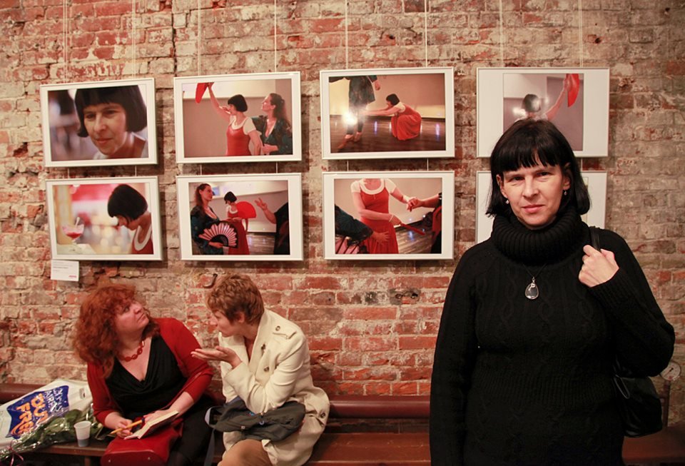 Тифлокомментарий: цветная фотография. Ирина в черном свитере стоит в выставочном зале, слегка улыбается, придерживает рукой черную сумку на плече. За ней на стене из необработанного красного кирпича висят восемь фотографий в белых паспарту. Это серия снимков с их с Элеонорой репетиции. Под снимками на лавочке сидят две женщины, рассматривают фотографии, что-то обсуждают.