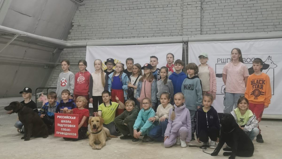 Тифлокомментарий: цветная фотография. Дети и подростки позируют для фотографии на фоне натянутых у стены афиш Российской школы подготовки собак-проводников ВОС. В первом ряду рядом с детьми сидят три лабрадора, мальчик держит небольшой плакат красного цвета с наименованием школы.