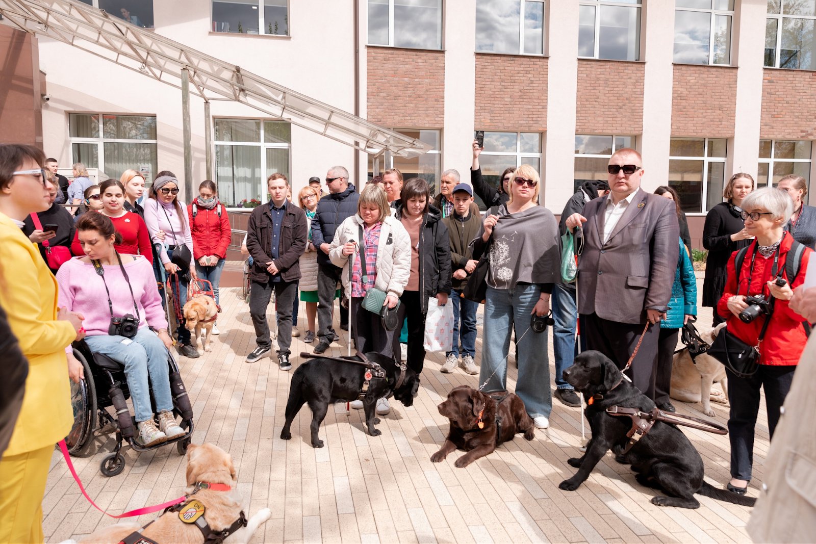 Тифлокомментарий: цветная фотография. Перед входом в кирпичное здание стоит группа людей в куртках и теплых кофтах. На некоторых мужчинах и женщинах надеты черные очки, а в руках у них белые тактильные трости. Рядом с ними собаки-проводники.
