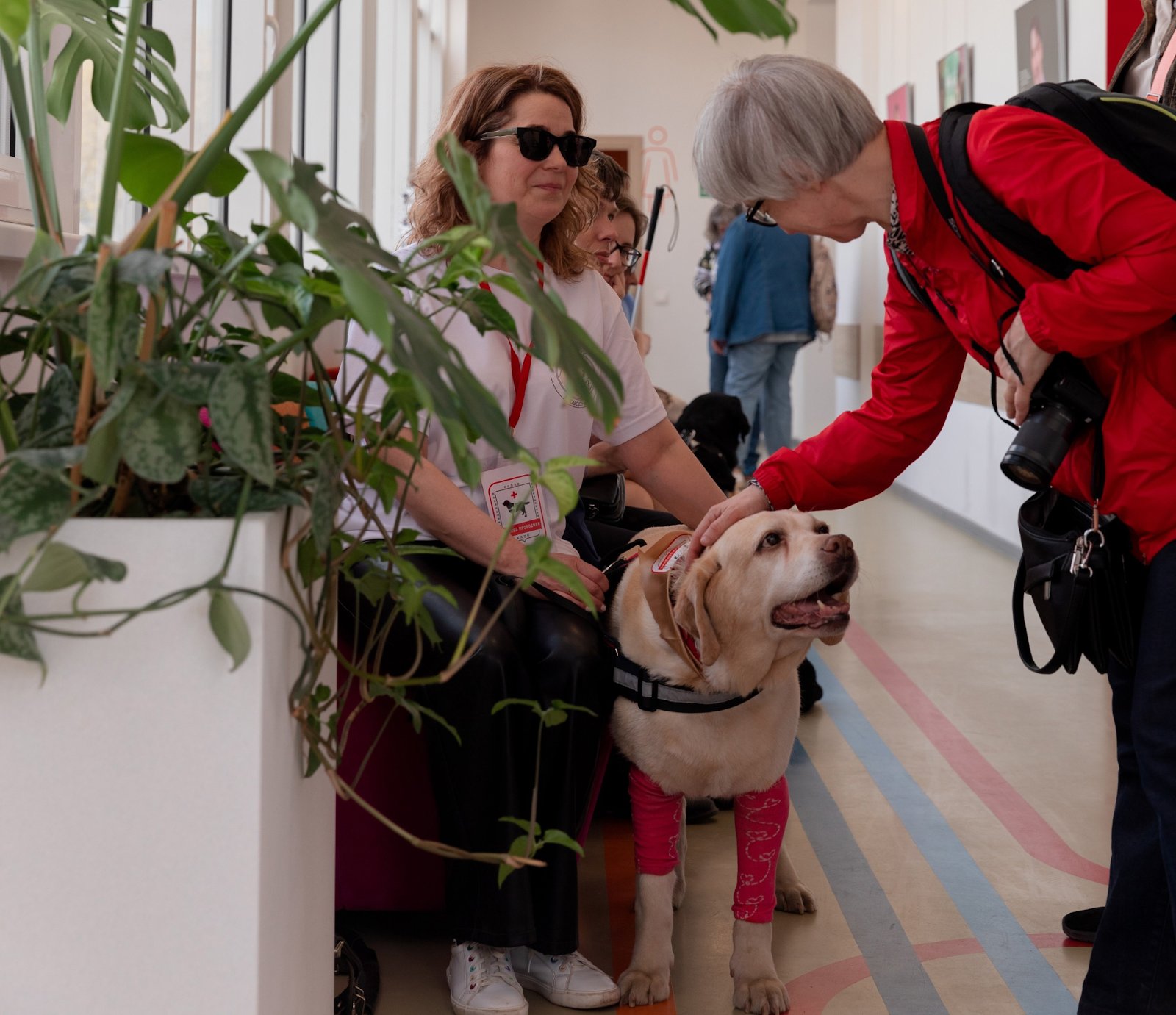 Тифлокомментарий: цветная фотография. В коридоре просторного светлого здания на лавочке сидит несколько женщин. На некоторых надеты очки, рядом с ними стоят собаки-проводники породы лабрадор. На этаже также размещена квадратная высокая клумба с растениями.