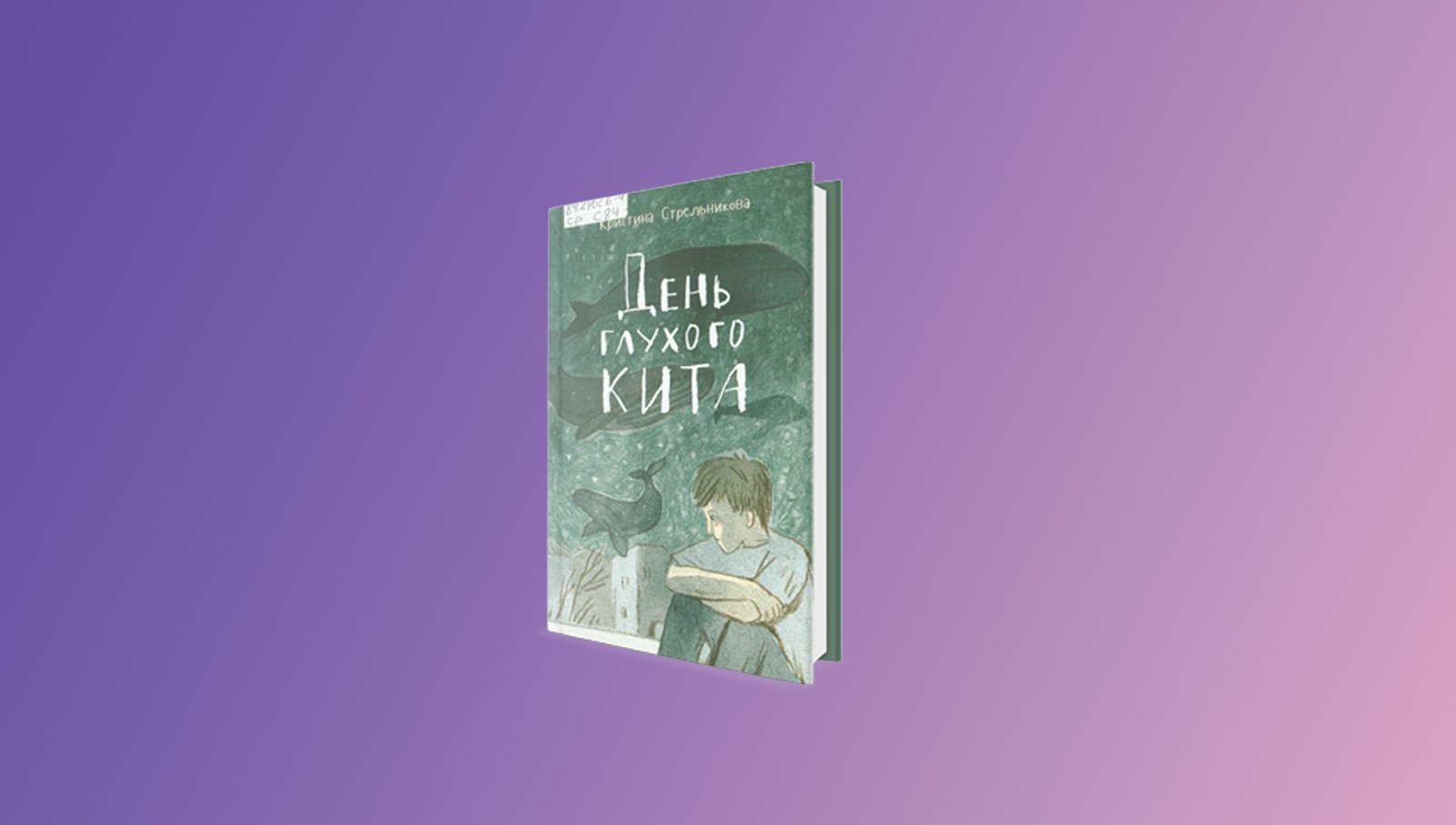 Тифлокомментарий: цветной коллаж. Здесь и далее — художественная книга на фиолетовом фоне. На зеленой обложке изображен русоволосый мальчик. Он сидит, прижав колени к груди. Над его головой плавают киты. Вверху белая надпись «Кристина Стрельникова», чуть ниже название книги крупными белыми буквами в три строчки «День глухого кита».