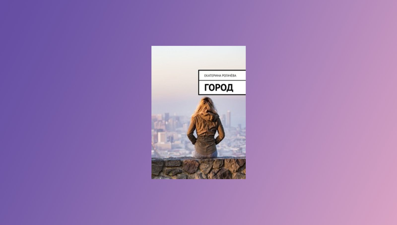 Тифлокомментарий: цветной коллаж. На обложке — фото светловолосой девушки в коричневой куртке. Она сидит спиной к нам на каменном парапете, смотрит на мегаполис, погруженный в утреннюю дымку. Вверху справа — белый прямоугольник с черными надписями: «Екатерина Рогачева» и «Город».