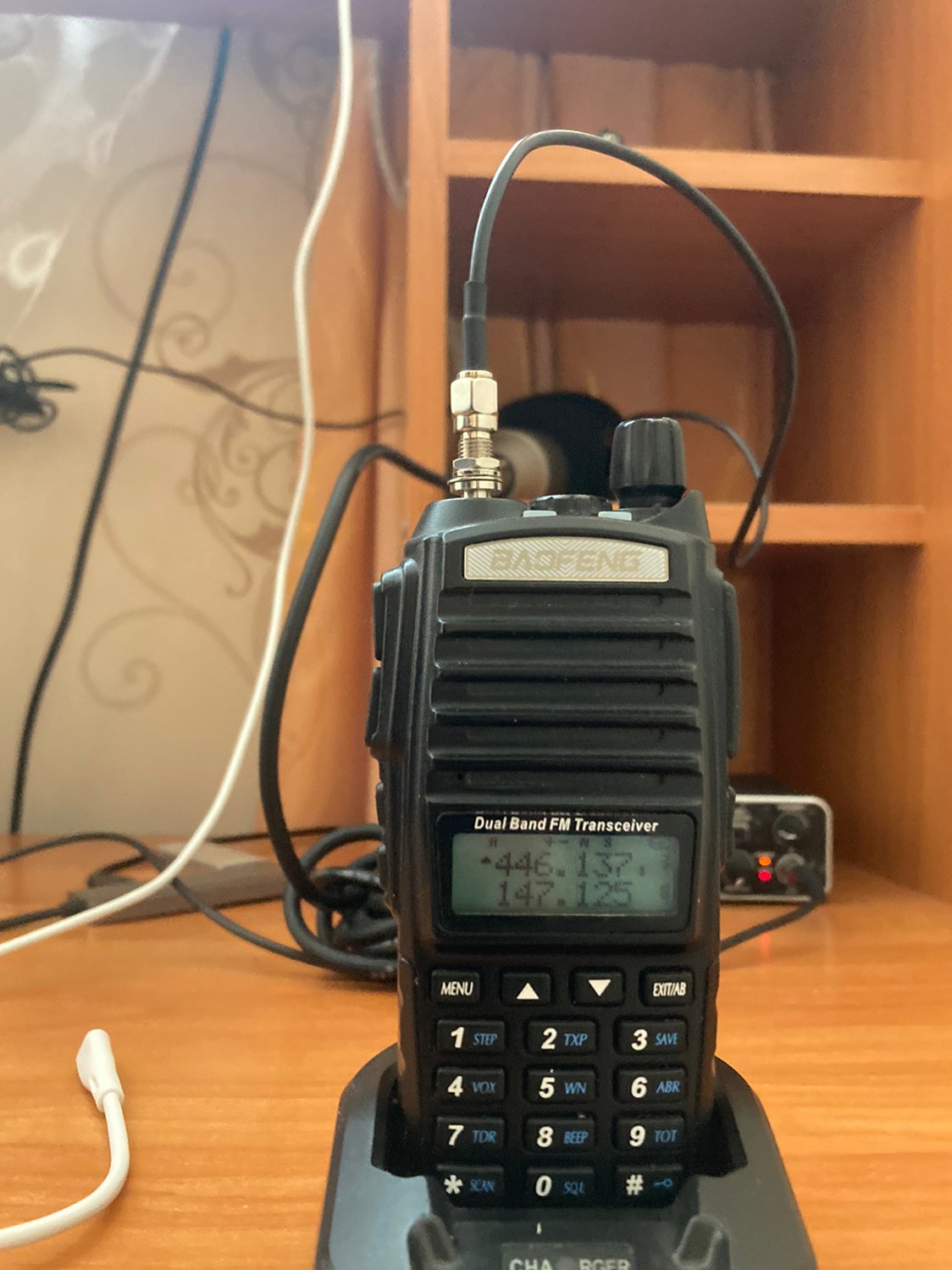 Тифлокомментарий: цветная фотография. На столе, в зарядном устройстве, стоит портативная черная рация. У массивного передатчика с антенной рифленая поверхность. Он снабжен дисплеем и рядом кнопок на центральной и боковой панелях.