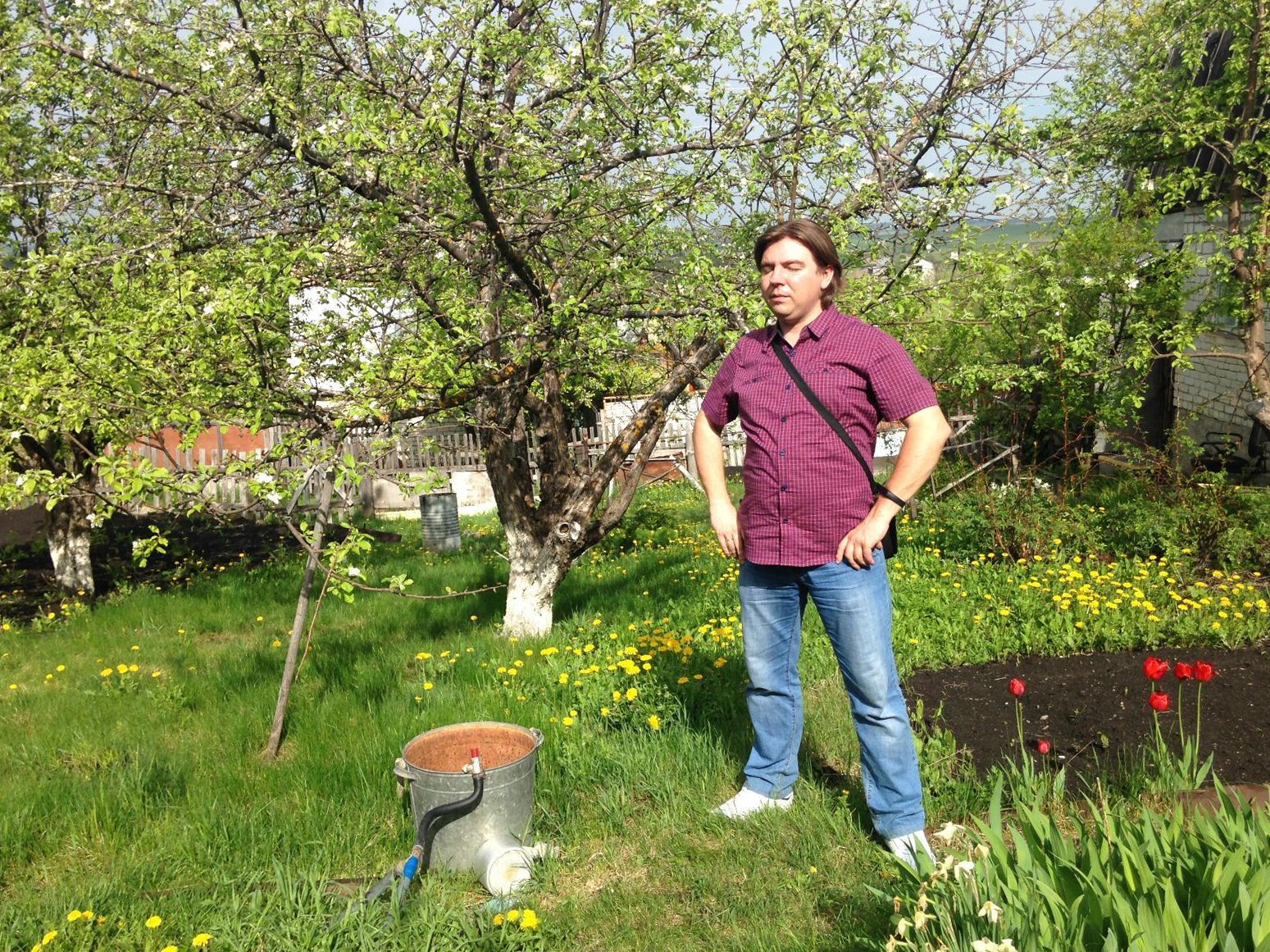 Тифлокомментарий: цветная фотография. Приусадебный участок в ясный день. Среди молодой травы желтеют одуванчики, цветут красные тюльпаны. В центре, уперев руки в бедра, стоит молодой человек плотного телосложения. Его глаза закрыты. Он одет в бордовую рубашку с коротким рукавом, голубые джинсы, белые туфли. Около его ног стоит цинковое ведро. За юношей широко раскинула ветви цветущая яблоня.