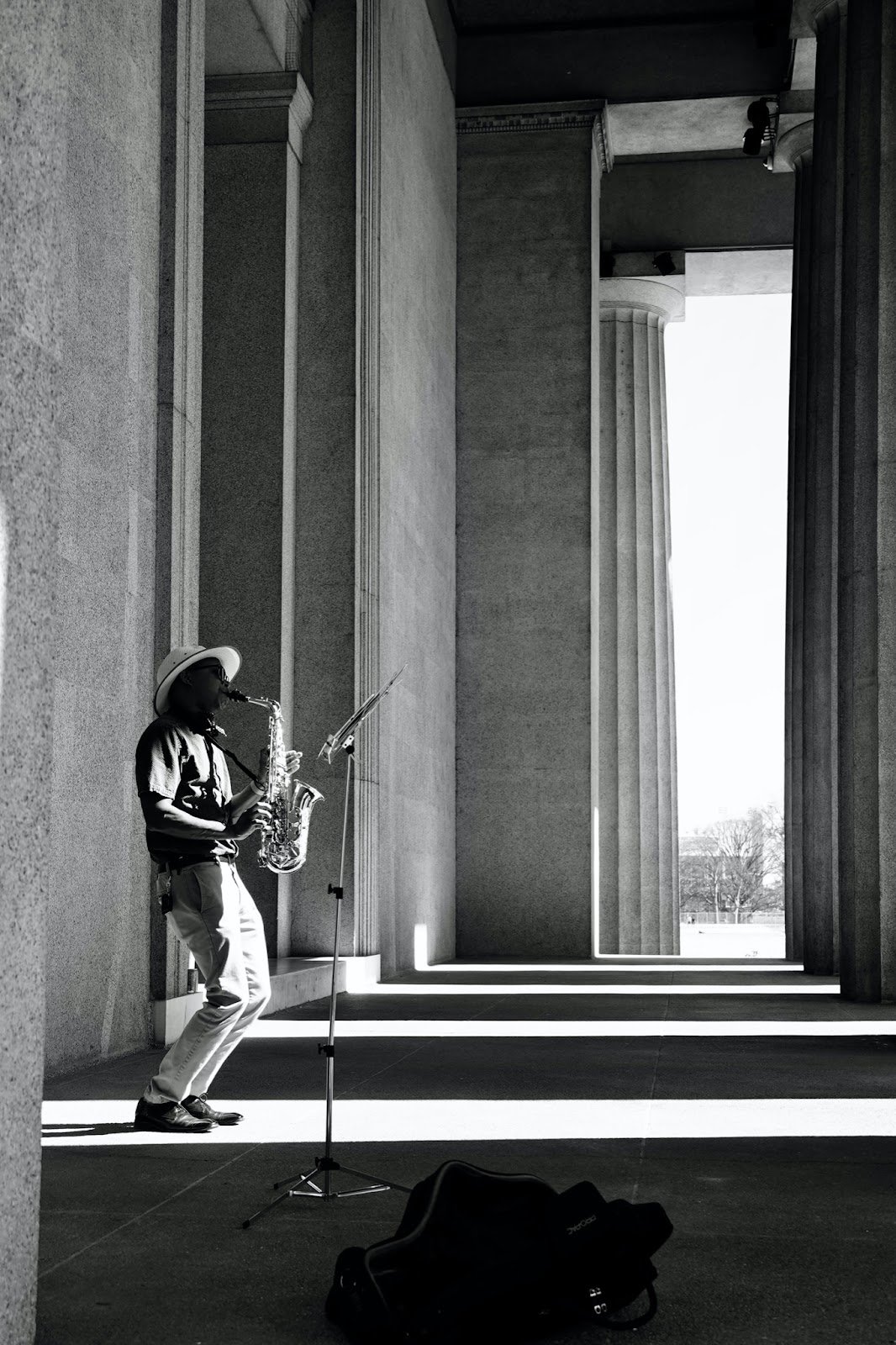 Тифлокомментарий: черно-белая фотография. В крытой галерее с колоннами за стойкой микрофона стоит стройный молодой мужчина, играет на саксофоне. На нем светлая шляпа и темные очки.