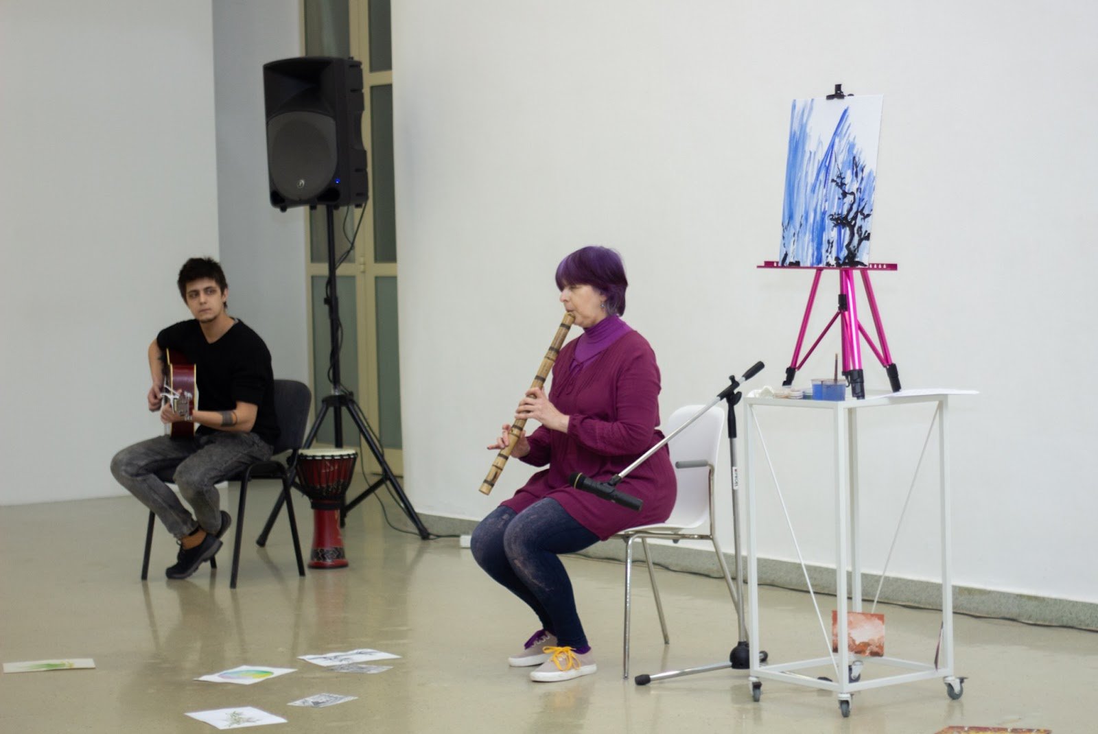 Тифлокомментарий: цветная фотография. Выступление Ирины Поволоцкой с аккомпаниатором. Музыканты сидят в зале с белыми стенами и высокими потолками. Темноволосый юноша играет на гитаре, внимательно смотрит на Ирину. Она солирует на флейте. На ней сиреневый пуловер, джинсы, волосы окрашены в фиолетовый цвет. Рядом с ней на мольберте закреплен рисунок: черное дерево на синем фоне.