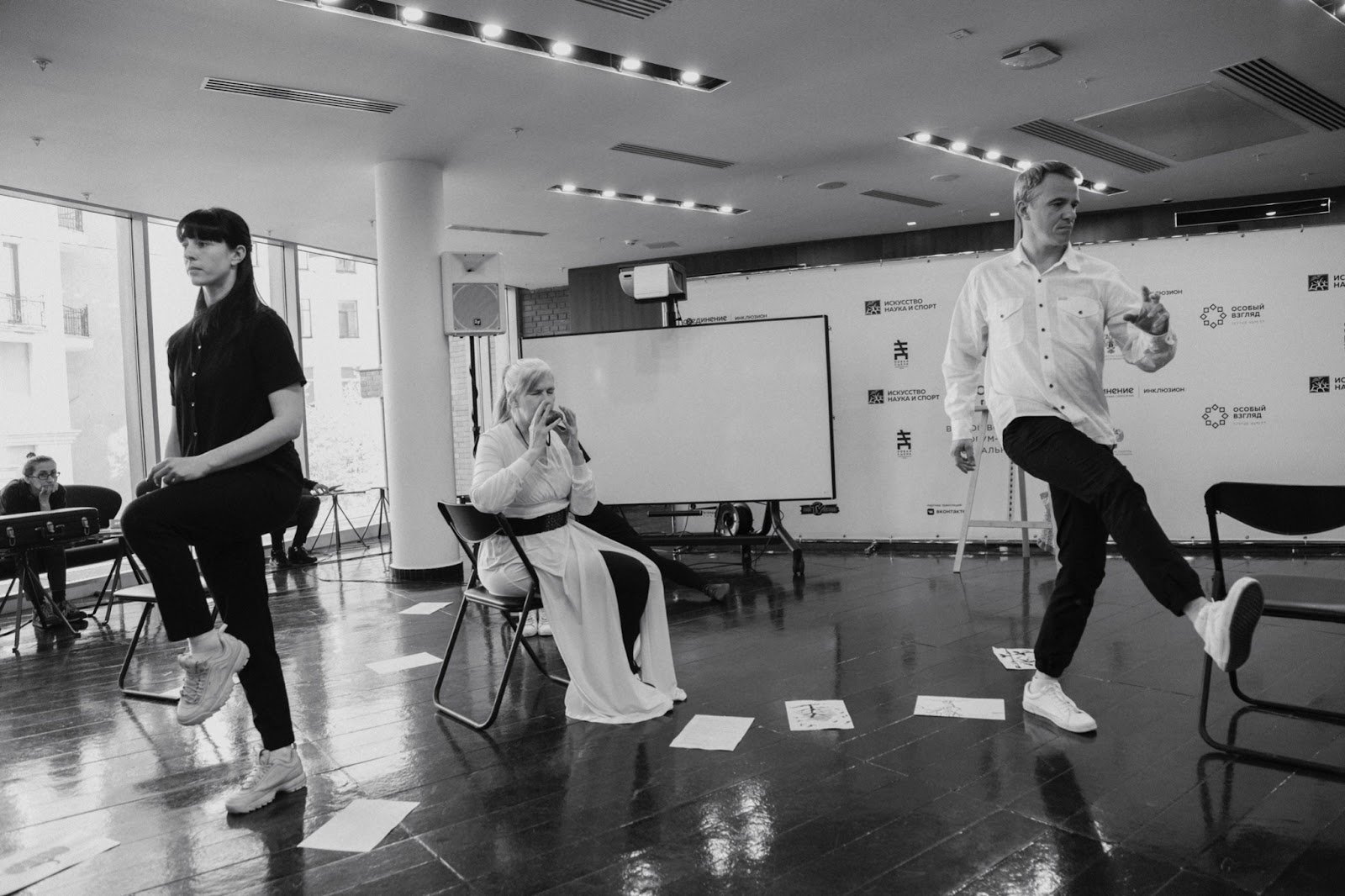 Тифлокомментарий: черно-белая фотография. Светлое помещение с панорамными окнами. В центре зала на черном стуле сидит Ирина Поволоцкая. Она играет на небольшом духовом инструменте. В разные стороны от нее, высоко поднимая ноги, расходятся юноша и девушка.