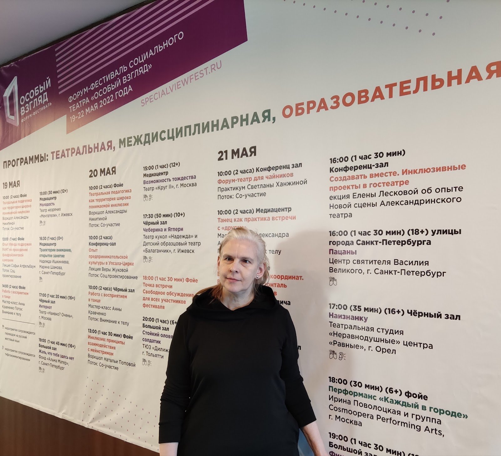 Тифлокомментарий: цветная фотография. Ирина Поволоцкая в черном свободном платье стоит на фоне баннера с программой форума-фестиваля социального театра «Особый взгляд». У нее светлые волосы, открытый лоб. Актриса улыбается.