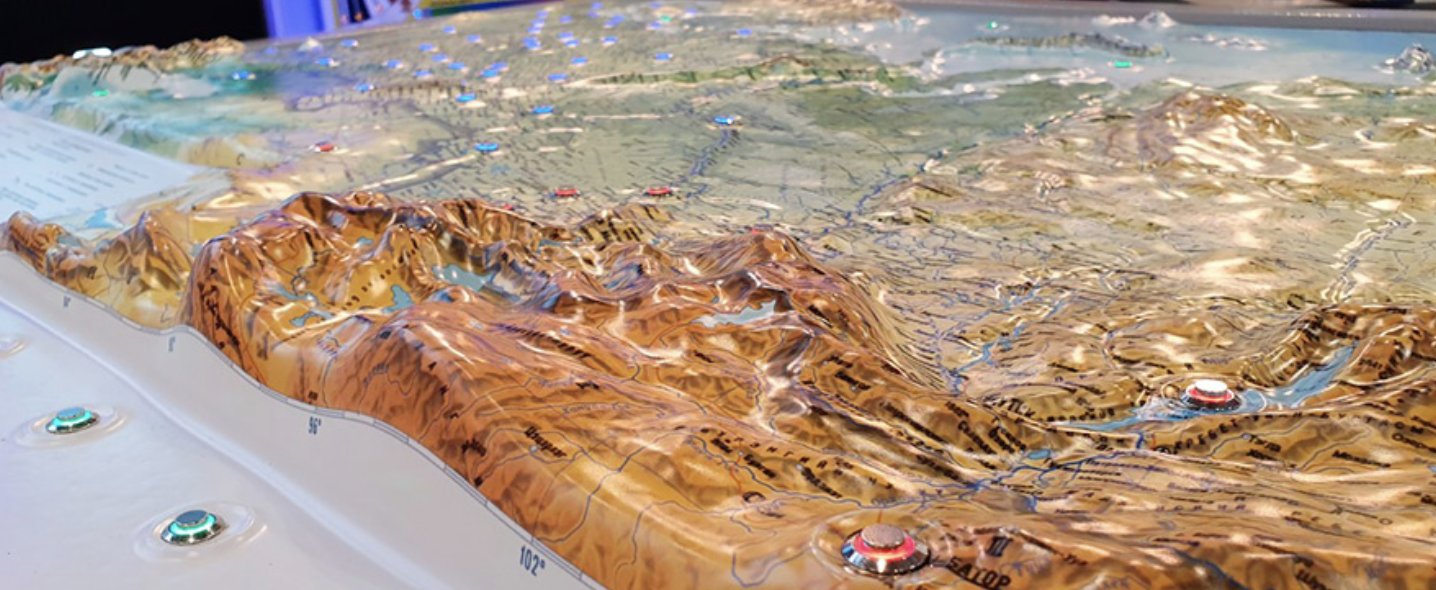 Тифлокомментарий: цветная фотография. Фрагмент 3D-карты России с рельефным ландшафтом: горами, реками, морями. Карта выполнена из пластика и лежит на плоском основании. На карте расположены красные и голубые информационные кнопки.
