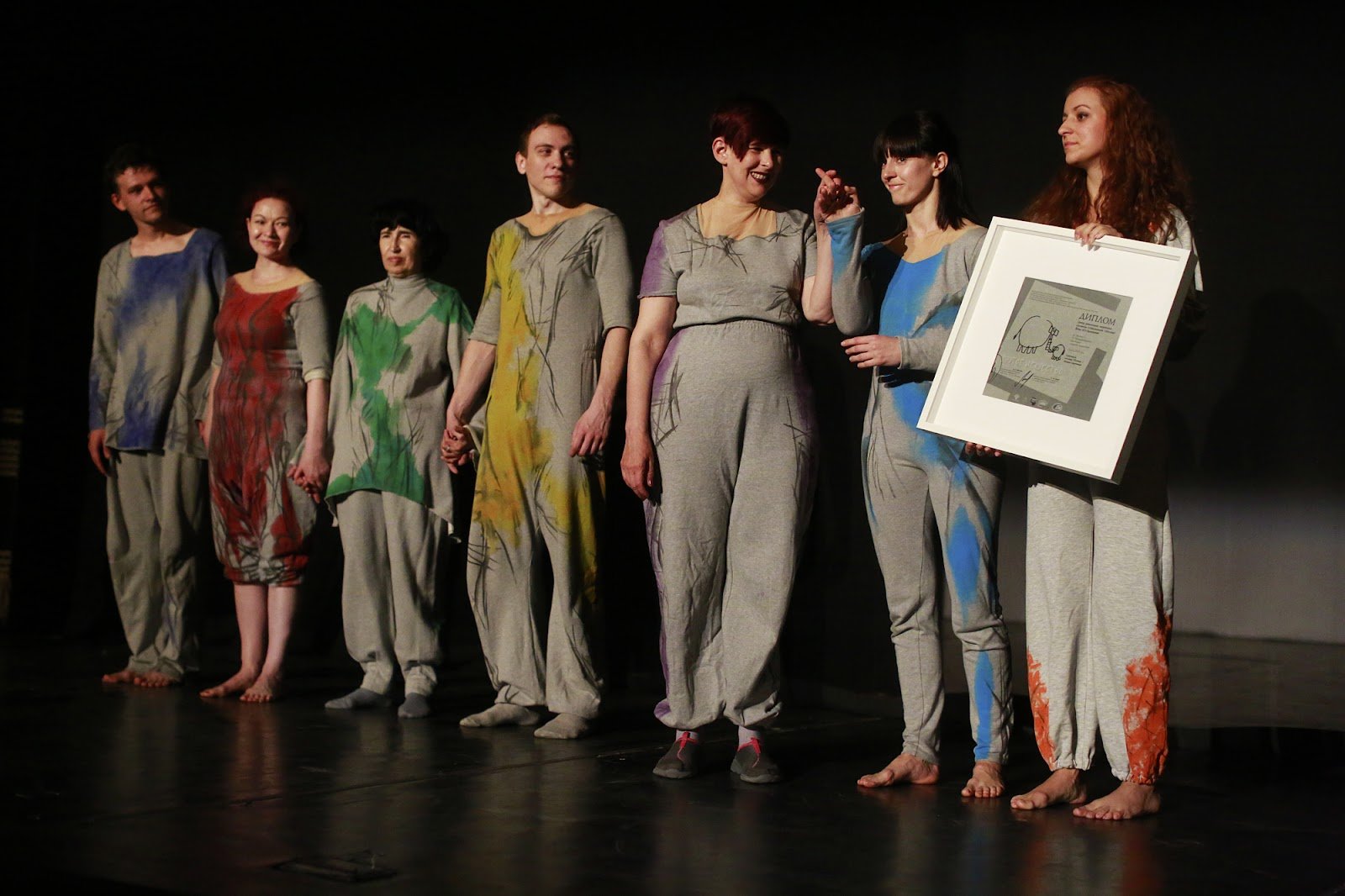 Тифлокомментарий: на черной сцене бок о бок стоят все семь актеров спектакля «Живые картины»: пять женщин разных возрастов и двое молодых мужчин. На них серые комбинезоны свободного кроя с пятнами краски, повторяющие семь цветов радуги, у каждого — свой цвет. У Ирины короткие фиолетовые волосы, на костюме мазки фиолетовой краски. Высокая девушка с длинными рыжими волосами, с оранжевой краской на комбинезоне, держит в руках квадратный диплом в широкой белой рамке.