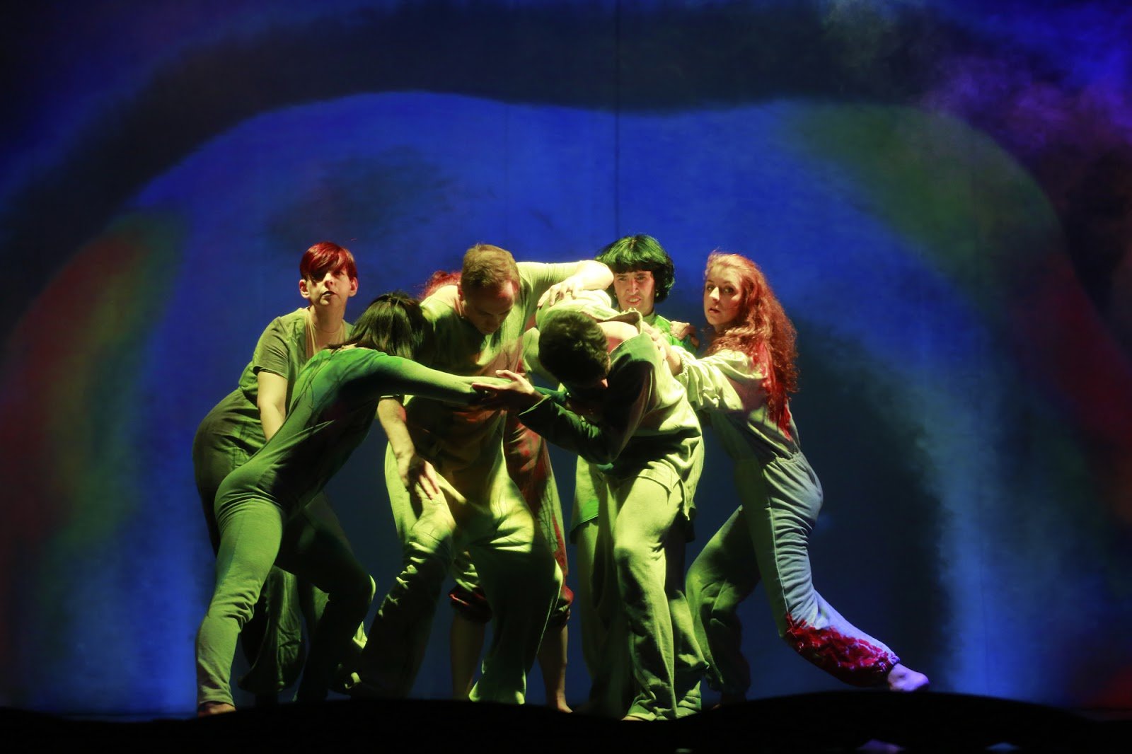 Тифлокомментарий: на сцене полумрак. На полу лежит девушка с рыжими волосами, прижимает колени к животу. Остальные стоят рядом, чуть наклонившись вперед, протягивают к ней руки. Их освещают лучи красного и зеленого света.
