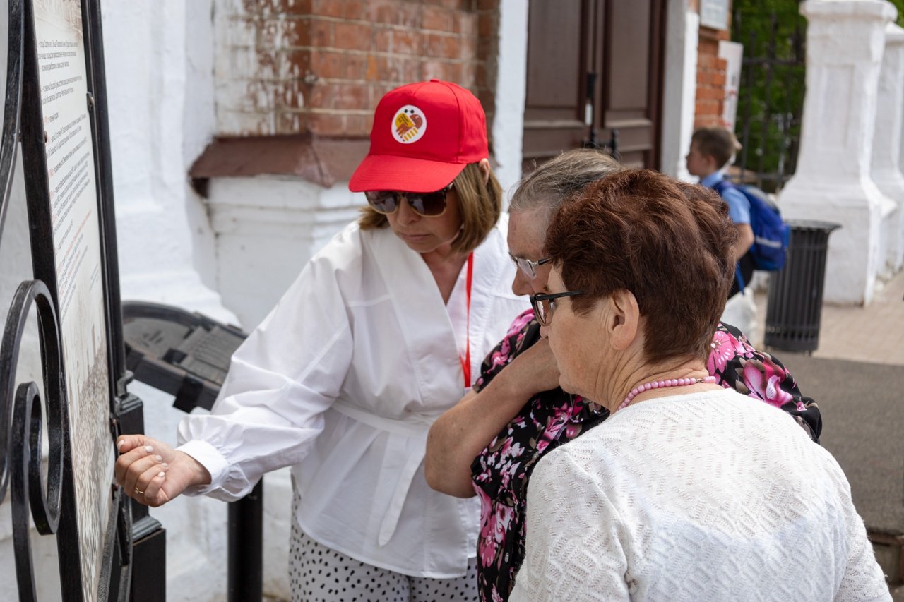 Тифлокомментарий: цветная фотография. Летняя экскурсия у стен сарапульского музея-заповедника. Три нарядно одетые женщины в очках рассматривают информационный щит в кованой раме. Одна из них, гид-волонтер в красной бейсболке, чуть касается рукой черно-белого изображения. На заднем плане виден тактильный барельеф музея и вход в главное здание.