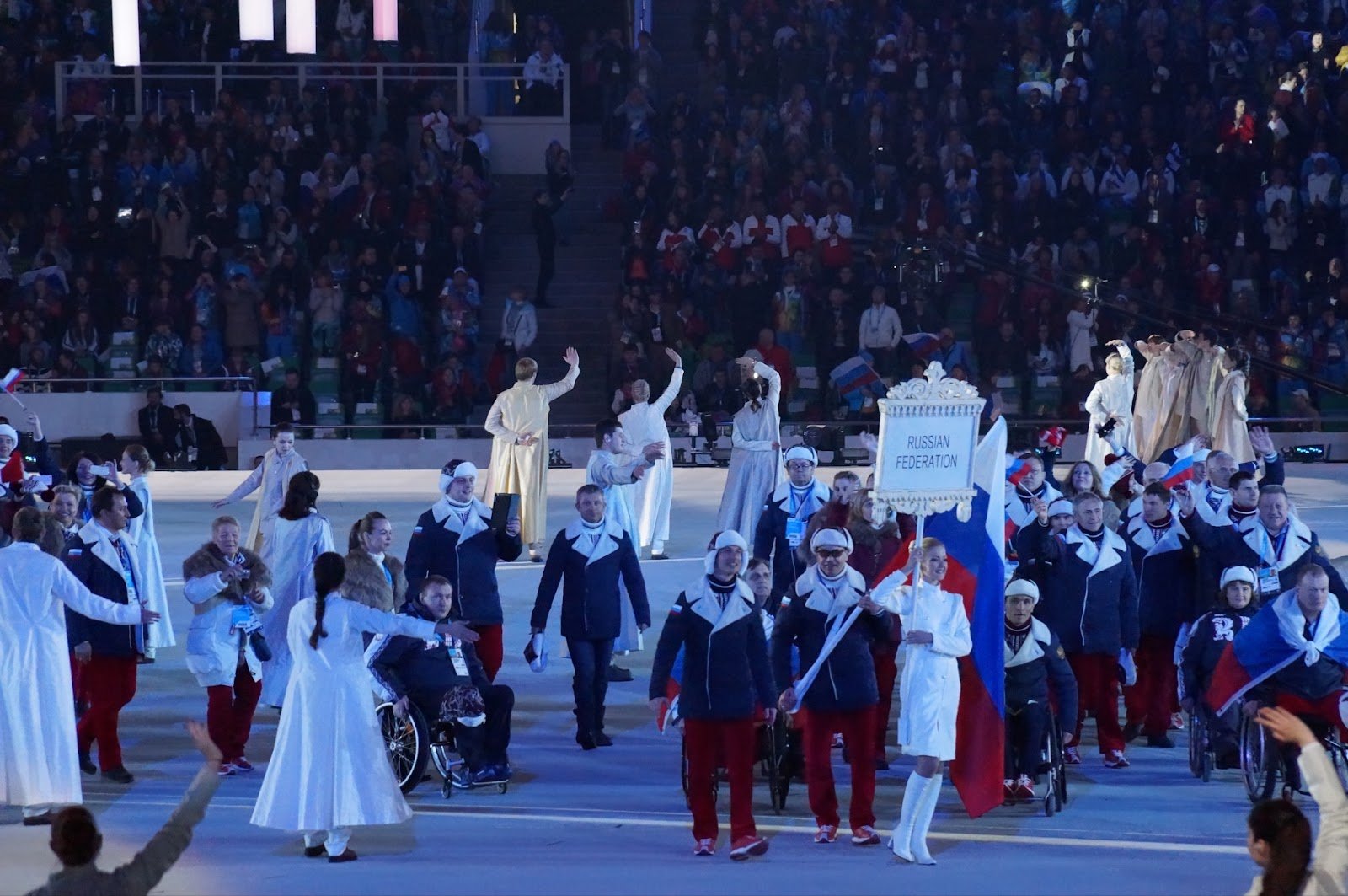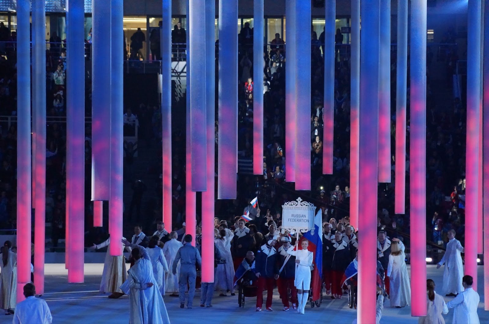 Тифлокомментарий: цветная фотография. Торжественная церемония открытия Паралимпиады в Сочи. Трибуны стадиона «Фишт» заполнены зрителями. Сверху вниз спускаются узкие длинные полотна, подсвеченные розовым и сиреневым цветами. На спортивную арену выходит делегация сборной России в одежде цветов российского триколора, в шапках-ушанках. Некоторые спортсмены на колясках, знаменосец во главе делегации несет флаг России. Паралимпийцев приветствуют артисты в белой свободной одежде.