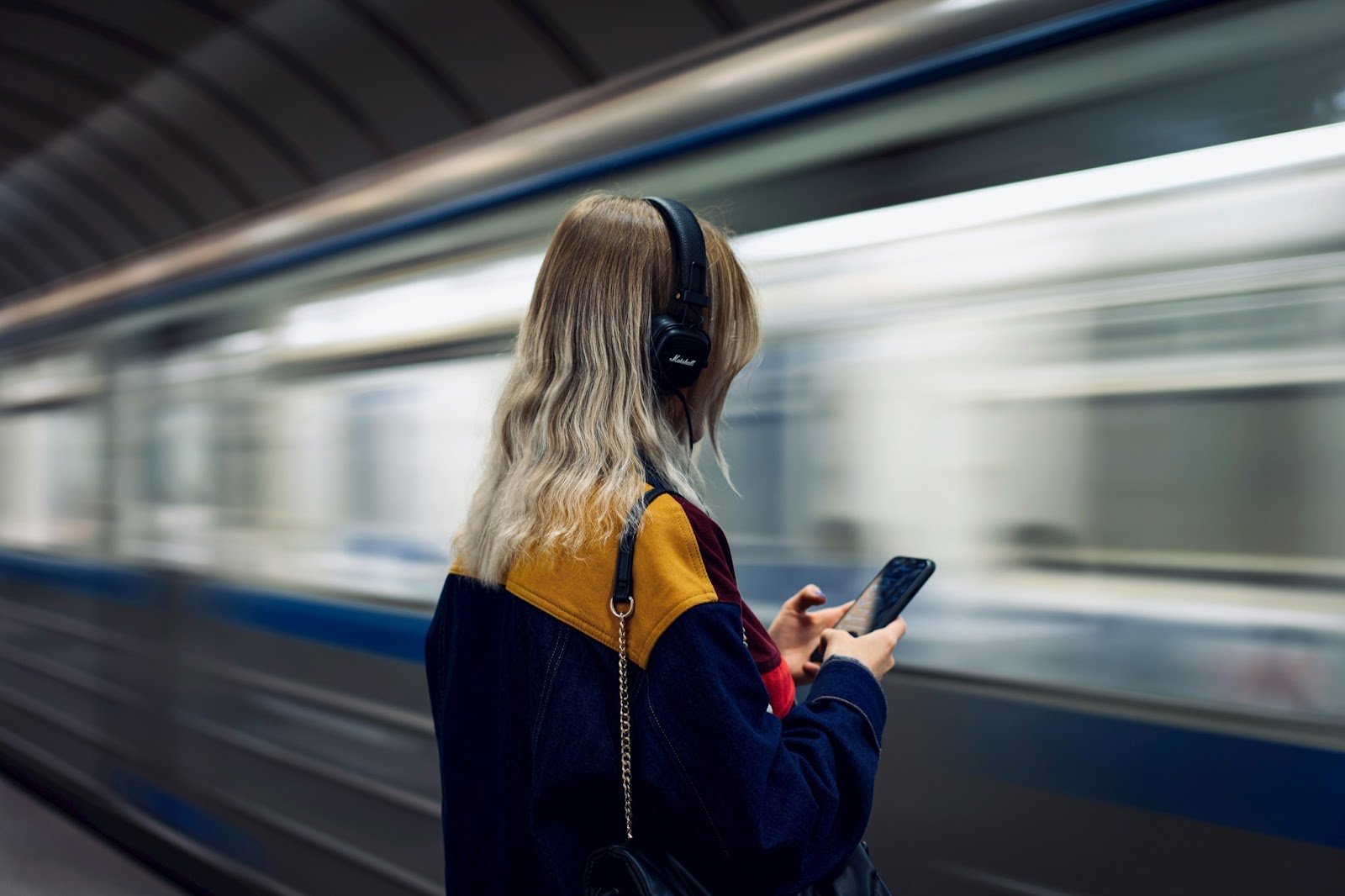 Тифлокомментарий: цветная фотография. На платформе станции метро, полубоком к нам, стоит хрупкая девушка в повседневной одежде со светлыми волосами до плеч. В руках блондинка держит смартфон, на ее голове массивные черные наушники. Прямо перед девушкой, мимо платформы, движется поезд.