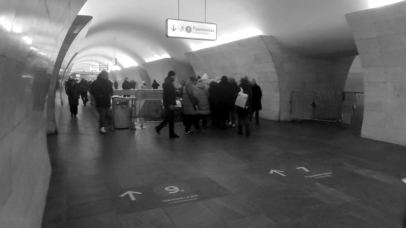 Тифлокомментарий: черно-белая фотография. Пересадочный узел на станции метро «Тверская». Поток людей устремляется к эскалатору на спуск, над которым висит световой указатель «Пушкинская» со стрелкой вниз. На подходе к эскалатору симметрично расположены два напольных указателя: «Пушкинская» и «Чеховская».