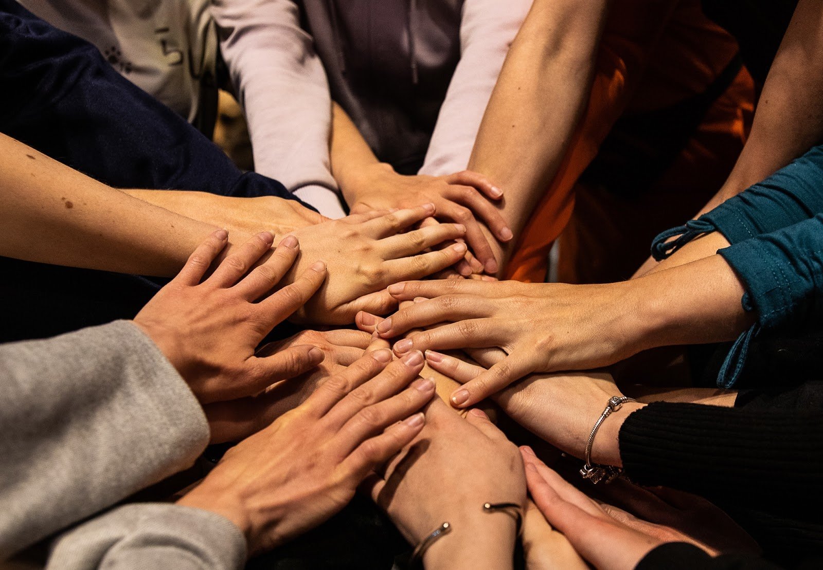 Тифлокомментарий: цветная фотография. Крупный план рук. Люди встали в круг и протянули руки в центр друг к другу.