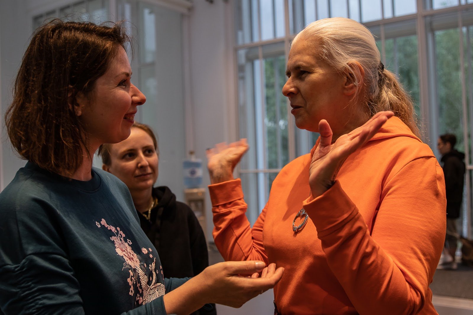 Тифлокомментарий: цветная фотография. В просторном помещении несколько женщин общаются, активно жестикулируя. Справа — Ирина Поволоцкая. Обе одеты в простую повседневную одежду. Фотограф поймал счастье и улыбку на их лицах.