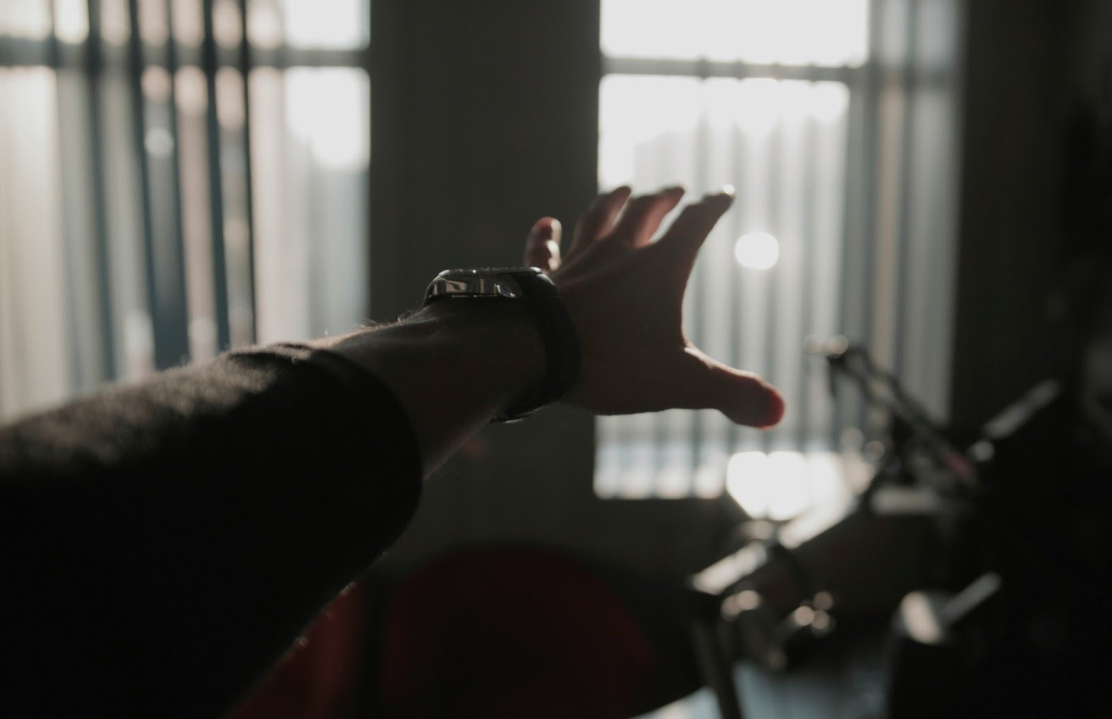 Тифлокомментарий: цветная фотография. Темное помещение с большими окнами. Через приоткрытые вертикальные жалюзи в него проникает солнечный свет. Крупным планом левая мужская рука с крупными научными часами, которая тянется к солнцу, сияющему за окном.