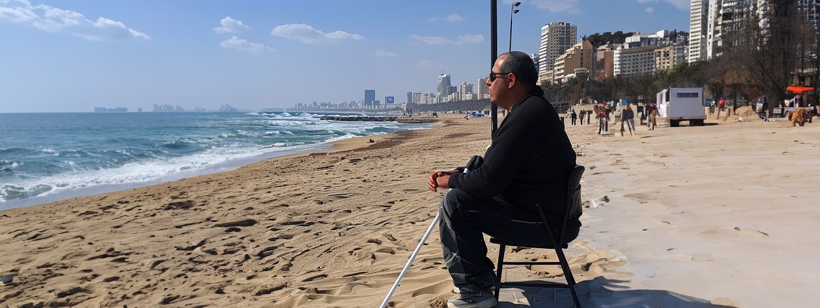 Тифлокомментарий: цветная фотография. Солнечный день в Хайфе. Вдоль морского побережья тянутся городские высотки. На песчаном берегу в легком кресле сидит мужчина средних лет. На нем плотная повседневная одежда и темные очки. Мужчина сложил перед собой руки, удерживая белую трость, его лицо обращено к морю.