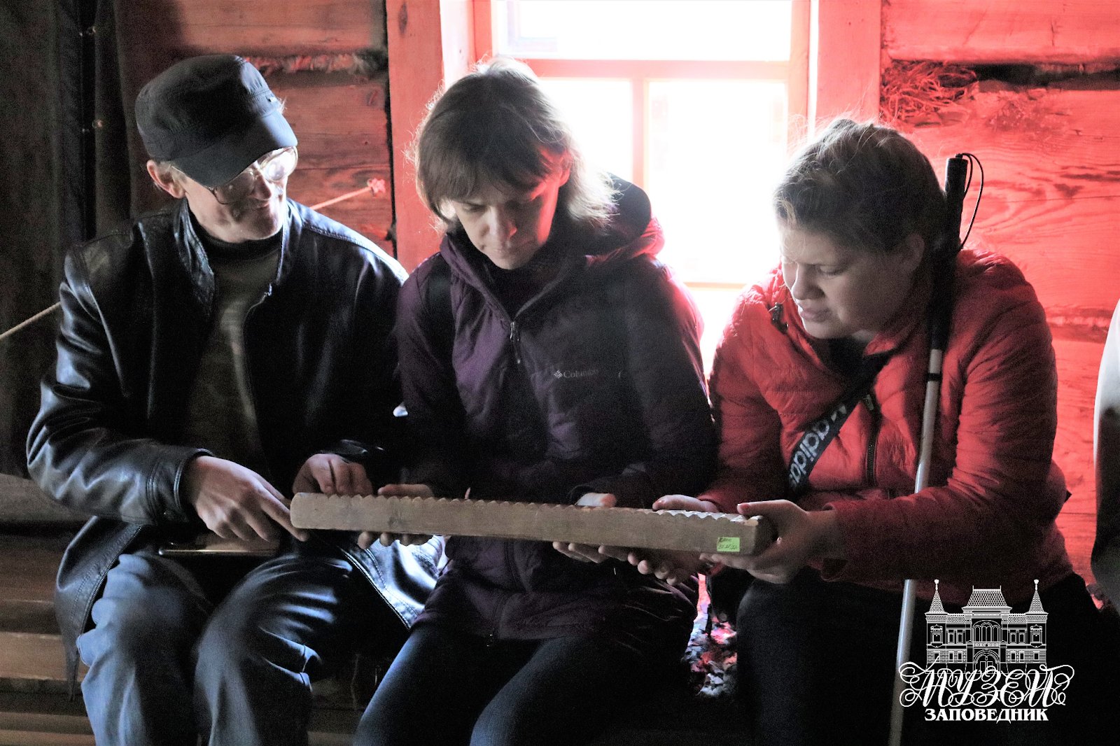 Тифлокомментарий: цветная фотография. В деревянной избе у окна сидят трое посетителей музея-заповедника в верхней одежде: мужчина средних лет в очках и две девушки, одна из них с белой тростью. Все трое держат в руках и изучают рубель— приспособление для стирки и глаженья белья. Это деревянная доска с поперечными скругленными валиками. Ее поверхность кажется волнообразной.