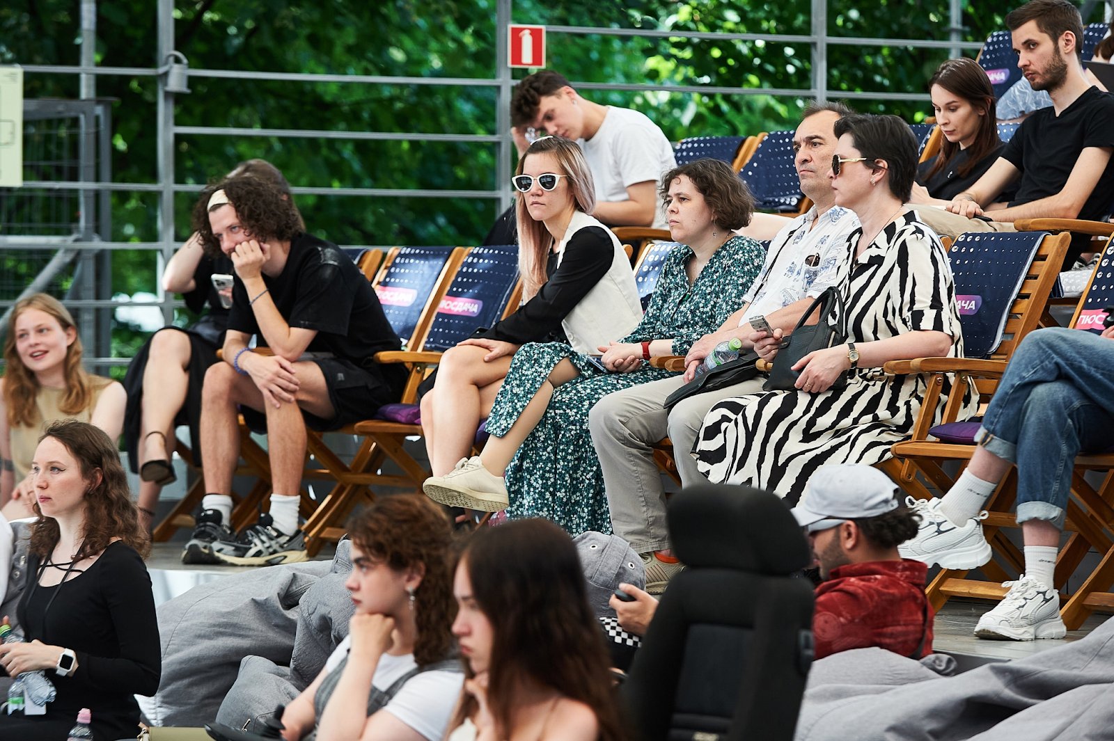 Тифлокомментарий: цветная фотография. Летний день в парке с высокими зелеными деревьями. В амфитеатре под открытым небом на деревянных раскладных креслах сидят мужчины и женщины разных возрастов в повседневных одеждах. Среди них незрячий автор этой статьи — Екатерина Шевичева. Это стройная молодая женщина с черными короткими волосами, в темных очках и платье с принтом зебры. В руке она держит серебристый диктофон.