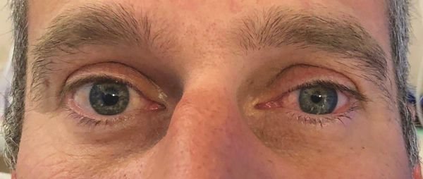 Тифлокомментарий: цветная фотография. Крупным планом карие глаза пожилого мужчины. Левая бровь приподнята, верхнее веко левого глаза опущено, почти полностью перекрывая зрачок.