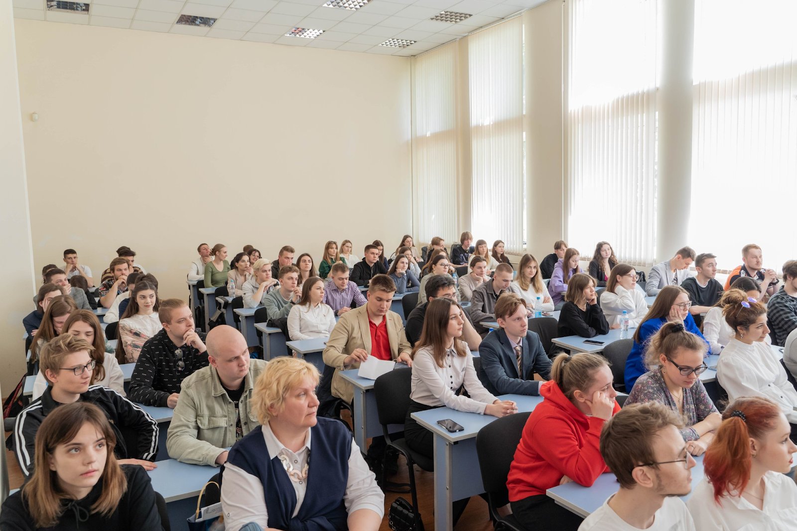Тифлокомментарий: цветная фотография. Просторная учебная аудитория с бежевыми стенами и высокими прямоугольными окнами заполнена слушателями. Студенты сидят за голубыми партами, внимательно смотрят в сторону выступающего.