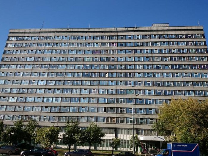 Тифлокомментарий: цветная фотография. На фоне безоблачного синего неба — университетское общежитие. Это тринадцатиэтажное серое здание с рядами ленточных окон.