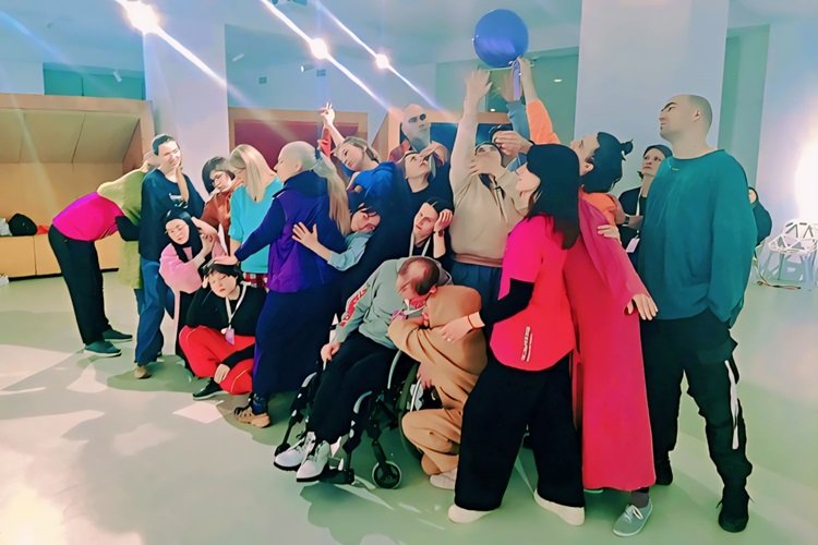 Тифлокомментарий: цветная фотография. Репетиция спектакля в ярко освещенном просторном зале с белыми стенами. Мужчины и женщины разных лет прижимаются друг к другу. Несколько человек сидят на корточках, один — в кресле-коляске, остальные стоят, кто-то наклонившись, кто-то вытянувшись. Женщина держит над головой голубой шарик, люди тянут к нему руки. Все с равнодушием смотрят в разные стороны. Среди них Ирина в длинном фиолетовом платье и фиолетовой жилетке. Ее длинные светлые волосы затянуты в хвост.