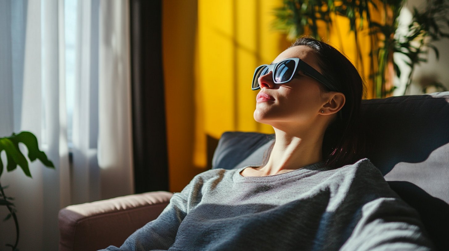 Тифлокомментарий: цветная фотография. Уютная гостиная, залитая солнцем, которое пробивается в комнату сквозь тюль и яркие желтые шторы. В кресле сидит брюнетка в сером пуловере и больших темных очках. Она откинулась на подушки, подставляя лицо солнечным лучам.