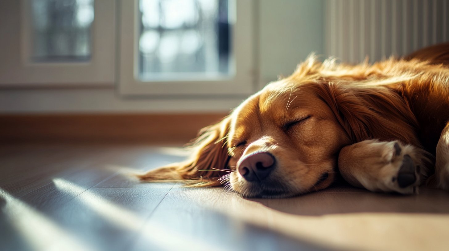 Тифлокомментарий: цветная фотография. В комнате, залитой солнечным светом, сладко спит рыжий спаниель. Он лежит на паркете, поджал под себя передние лапы.