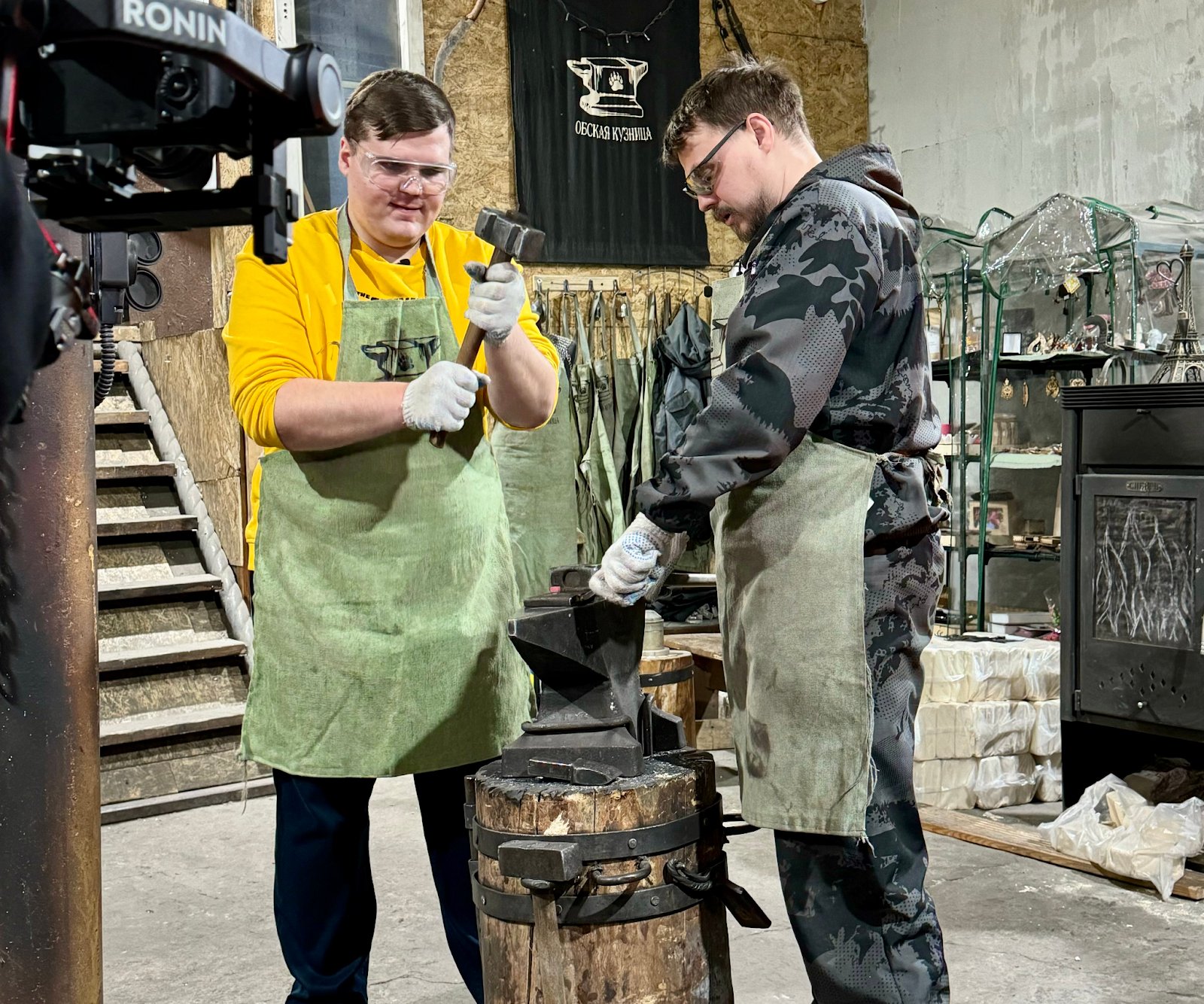 Тифлокомментарий: цветная фотография. Владимир и темноволосый мужчина стоят в ярко освещенной кузнице перед наковальней. Кузнец железными щипцами держит раскаленную заготовку, Владимир заносит над ней молот. На обоих прозрачные защитные очки, зеленые фартуки и белые перчатки.