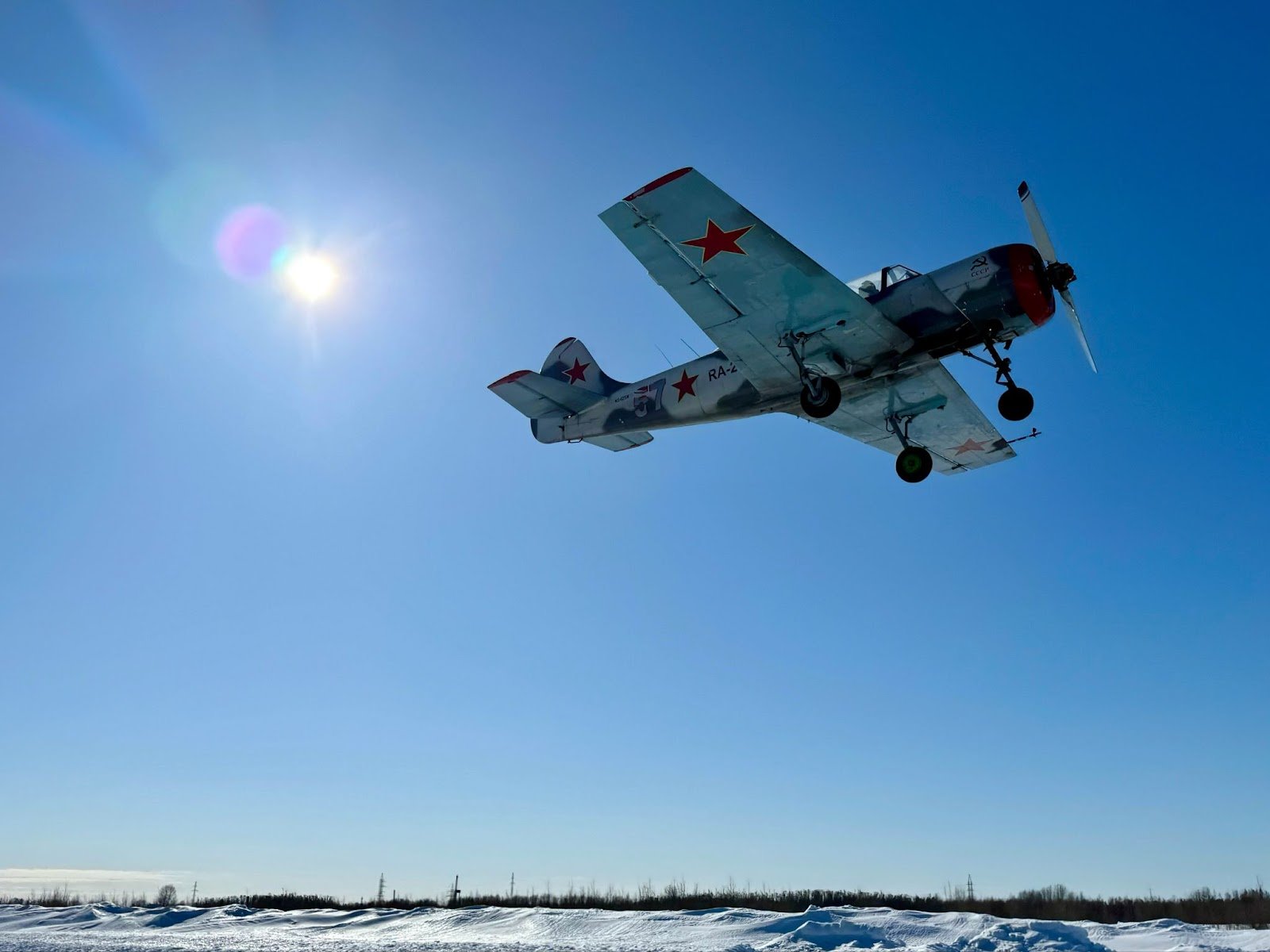 Тифлокомментарий: цветная фотография. Солнечный зимний день. В безоблачное синее небо взлетает серый двухместный самолет с винтом на носу. На крыльях, фюзеляже и хвостовой части — красные пятиконечные звезды.