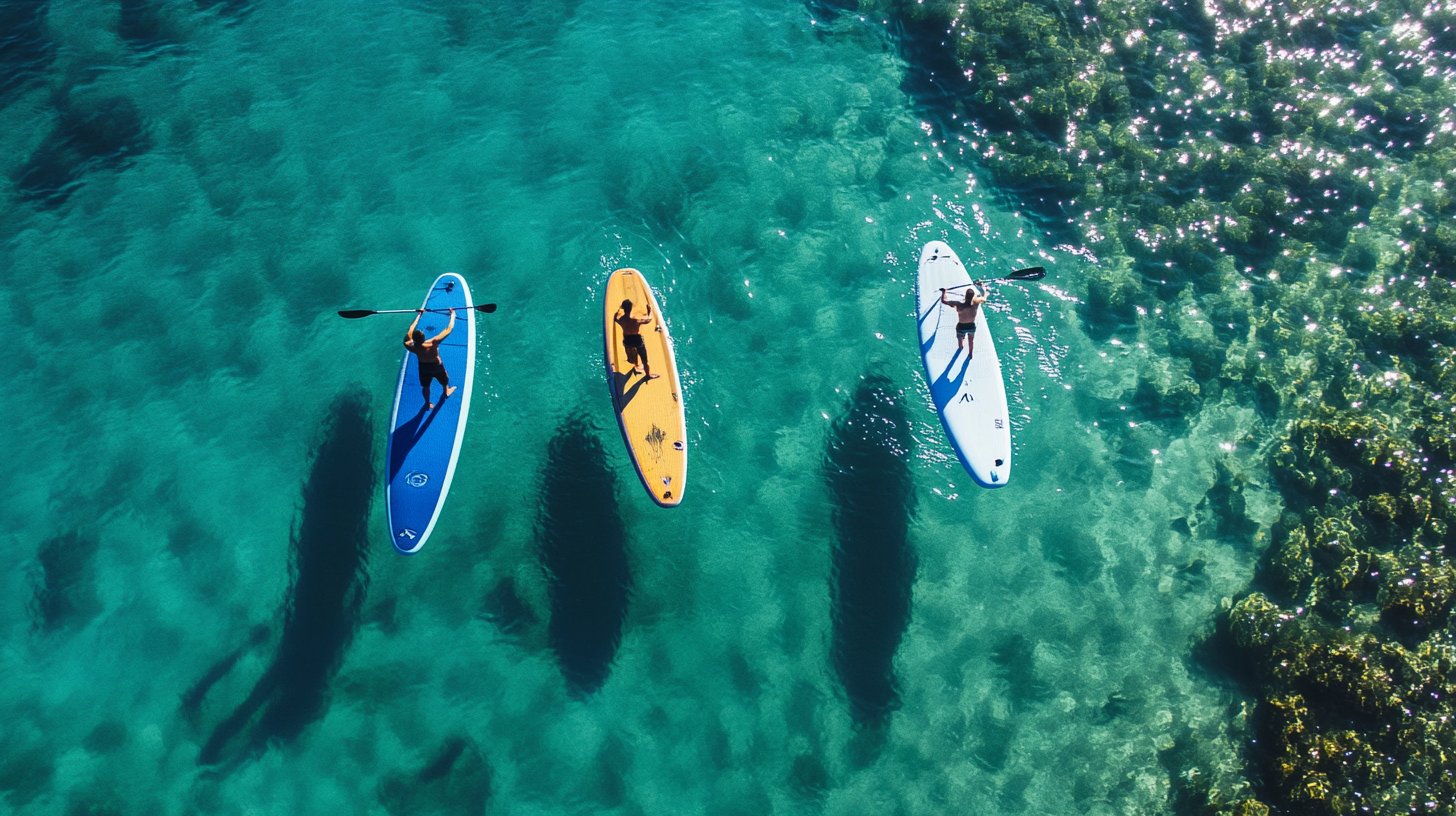 Тифлокомментарий: цветная фотография. Летний солнечный день. Вид сверху на неглубокий водоем с прозрачной бирюзовой водой. Трое серферов движутся на цветных досках параллельно друг другу. Каждый из спортсменов стоит на сапе, гребет длинным веслом.