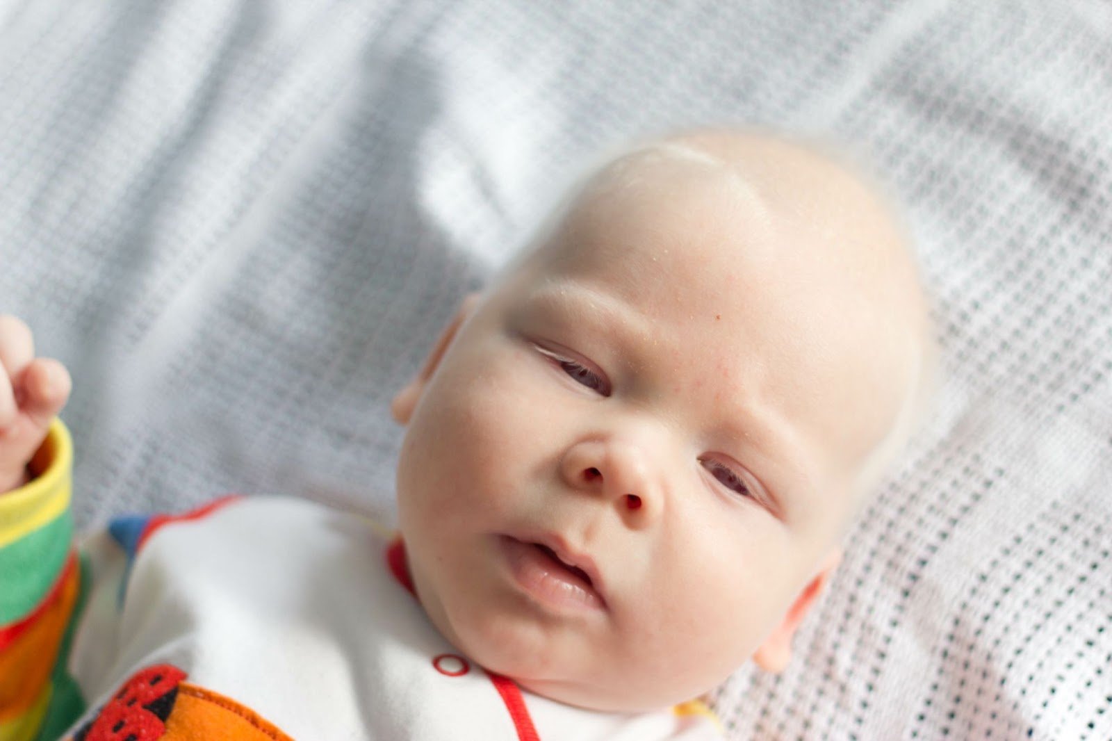 Тифлокомментарий: цветная фотография. На белой простыне лежит младенец с альбинизмом в разноцветном комбинезончике. Глаза и рот чуть приоткрыты, на головке — едва заметный пушок белых волос.
