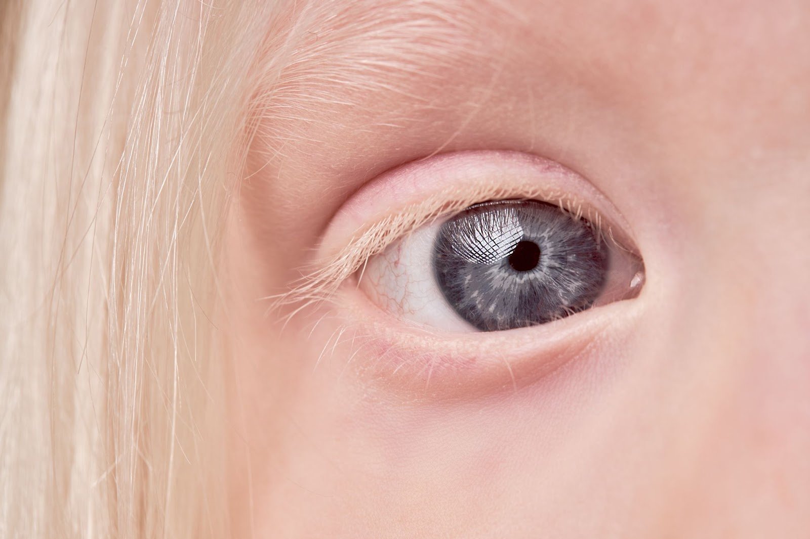 Тифлокомментарий: цветная фотография. Крупным планом — глаз девочки с альбинизмом, с серой радужкой, белой бровью и ресницами. У виска свисает прядь белых волос.