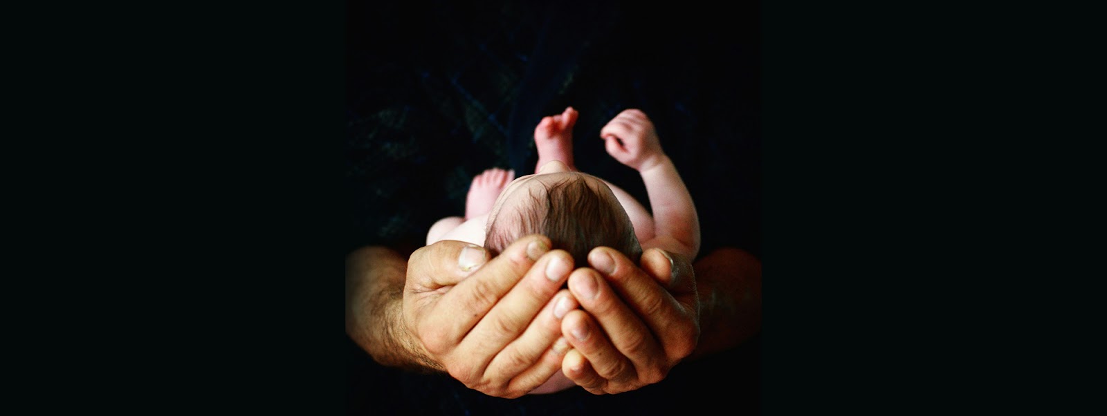 Тифлокомментарий: цветная фотография. Крупный план. В детской кроватке с одеяльцами и мягким бортиком лежит новорожденный ребенок, одетый в светлую фланелевую распашонку. Женская рука осторожно держит малыша за пальчики.