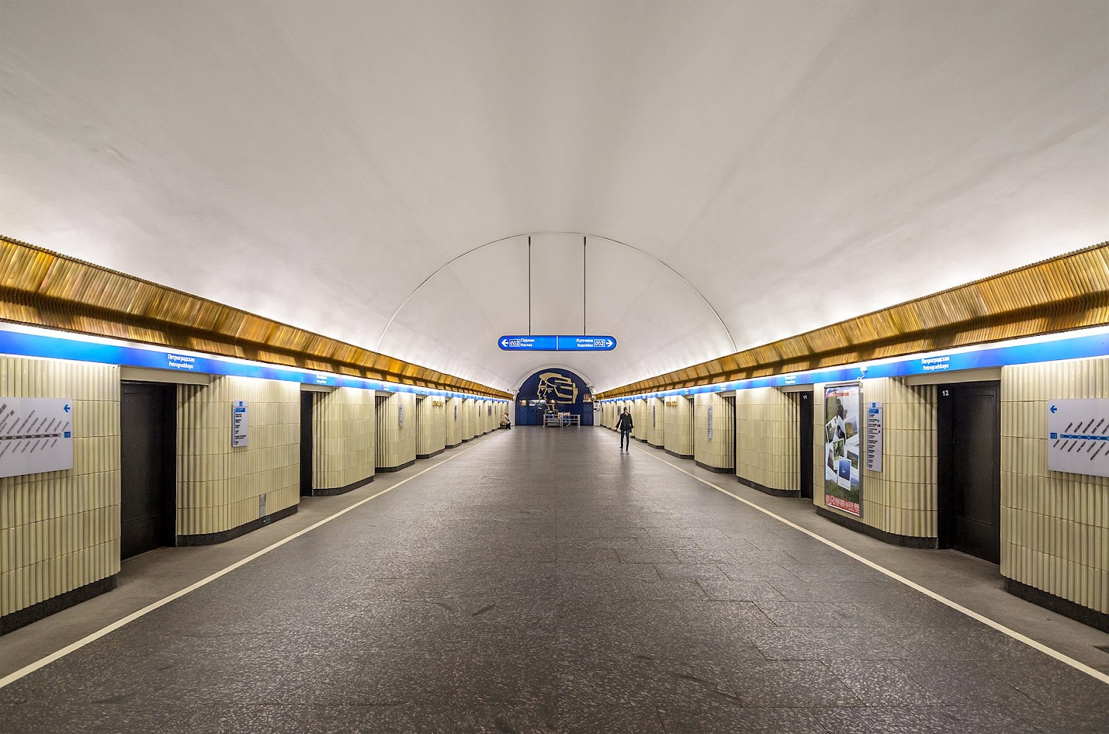Тифлокомментарий: цветная фотография. Ярко освещенная станция метро Петроградская в Санкт-Петербурге. На стенах, облицованных светлой рельефной плиткой, расположены схемы движения, под потолком в центре зала висит синий указатель. Края широкой гранитной платформы обозначены белой полосой. Черные платформенные двери, ведущие к зоне посадки, закрыты.