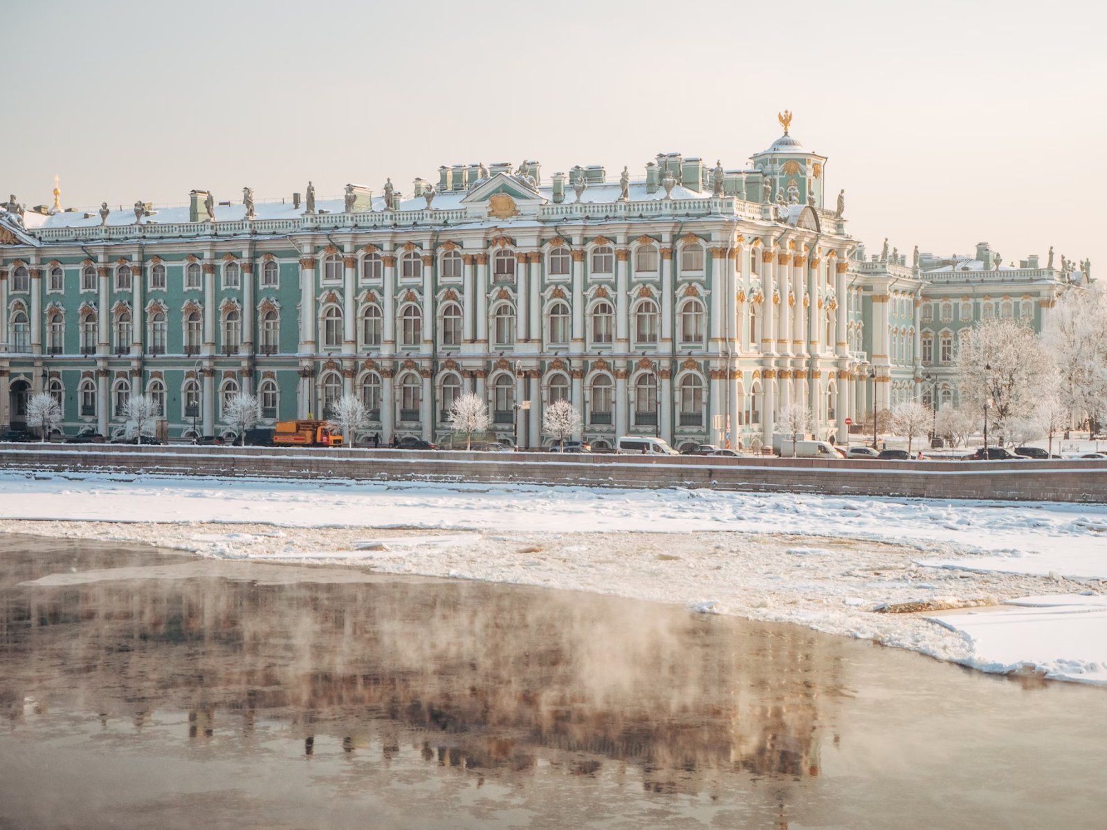 Тифлокомментарий: цветная фотография. Зимний дворец со стороны Невы в морозный день. Трехэтажное здание в стиле барокко богато декорировано лепниной. Его строгий бирюзовый фасад украшает вереница белоснежных колонн. На карнизе крыши с балюстрадой видны многочисленные древнеримские статуи и вазы.