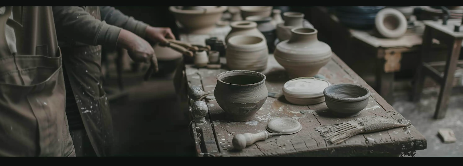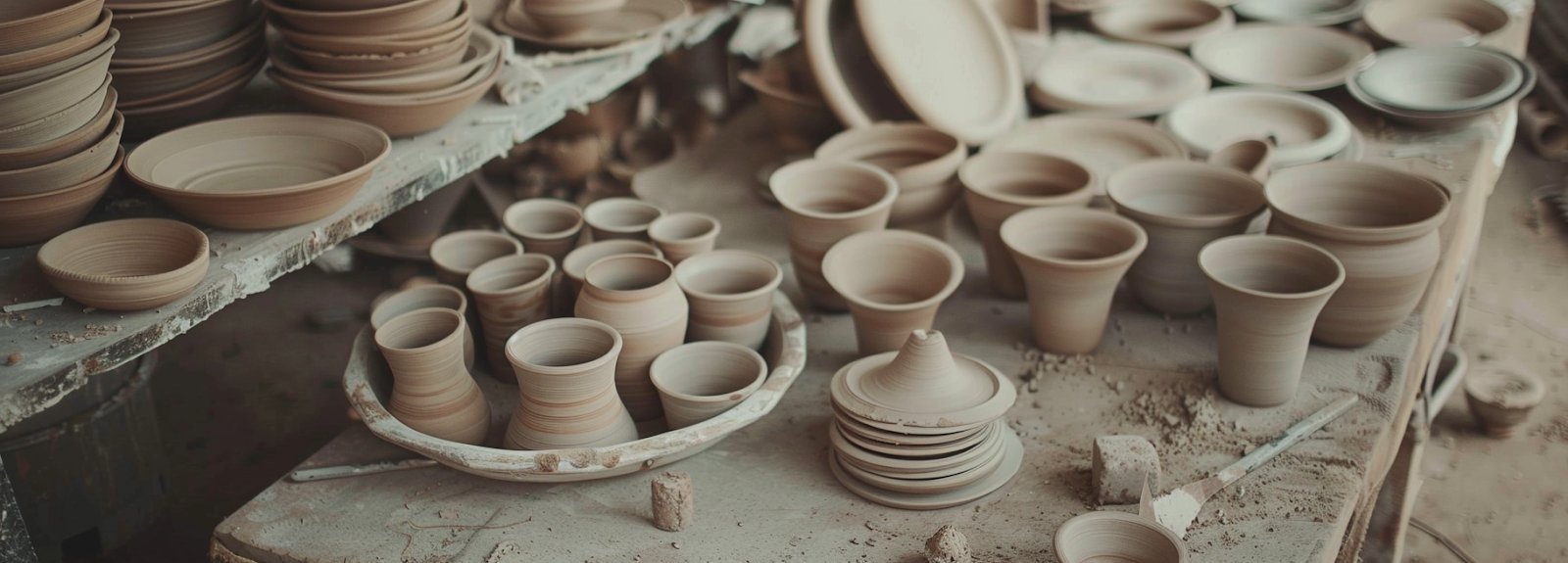Тифлокомментарий: цветная фотография. На серой горизонтальной поверхности, измазанной глиной, стоят чаши с белой глазурью, стопки глиняных горшков и лежат инструменты: гребешки, скребки, кисточки.
