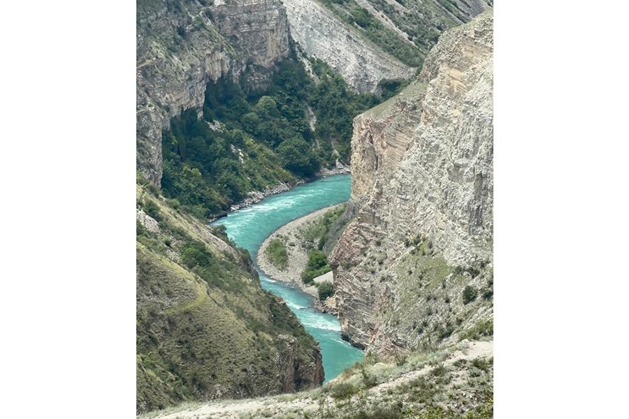 Тифлокомментарий: цветная фотография. Сулакский каньон. Река бирюзового цвета делает изгиб в глубоком узком ущелье. Она бежит стремительно вдоль отвесных каменных стен, поросших у подножья густой зеленью.