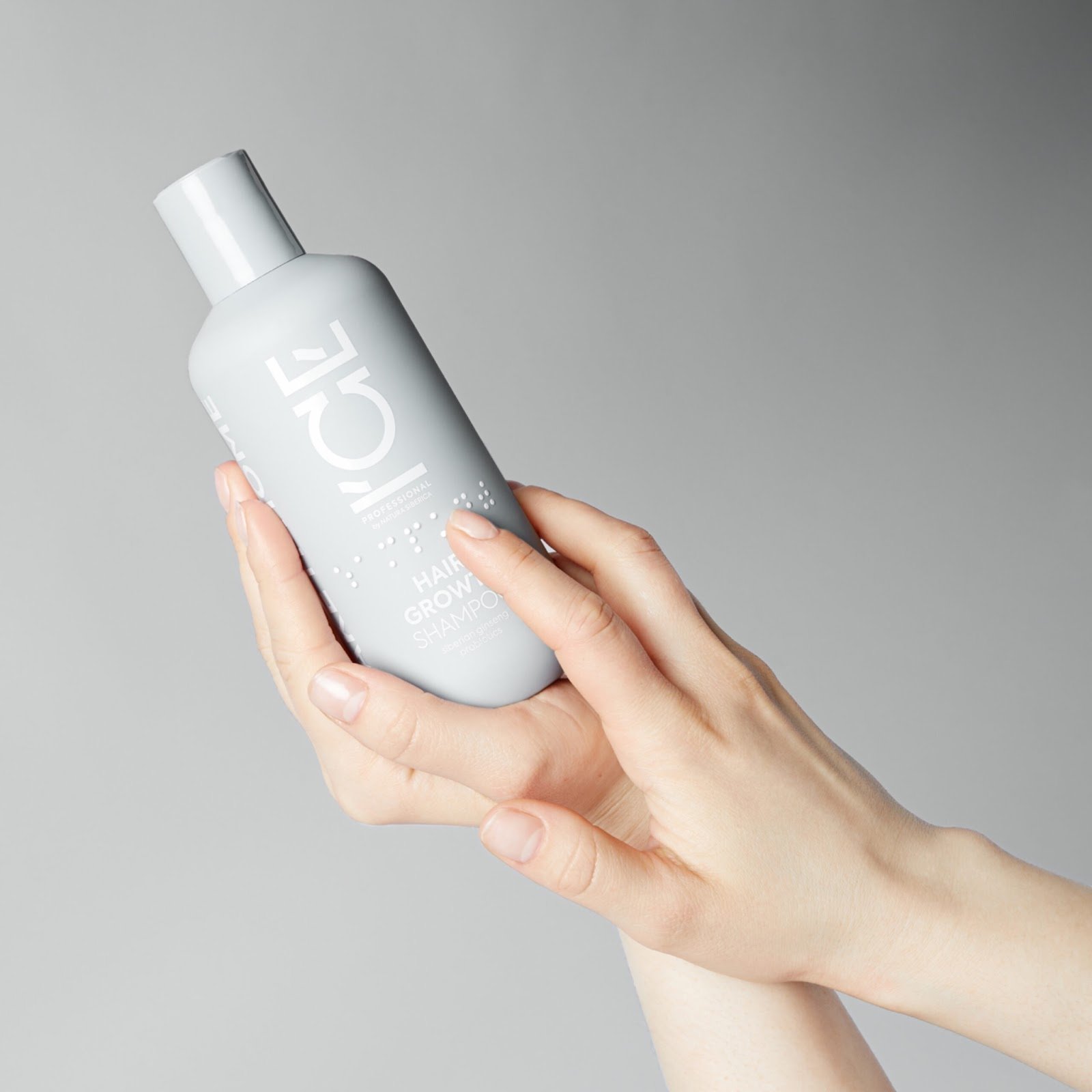 Тифлокомментарий: цветная фотография на светлом фоне. Женские руки держат голубой пластиковый флакон шампуня. Его название написано на латинице крупными белыми буквами, ниже оно продублировано шрифтом Брайля. Ладонь левой руки удерживает округлый флакон за основание, пальцы правой руки касаются выпуклых точек шрифта.