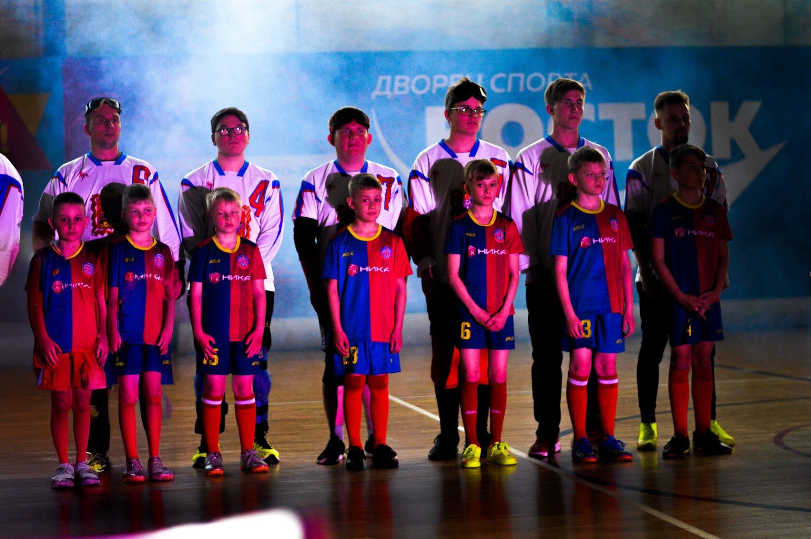 Тифлокомментарий: цветная фотография. На площадке с приглушенным светом в два ряда стоят спортсмены: взрослые и дети. Во втором ряду стоят шесть юношей в белой форме с крупными красными цифрами на груди. Некоторые из голболистов в очках. Перед игроками выстроились мальчики младшего школьного возраста в красно-синей спортивной форме. Все стоят, опустив руки, расправив плечи, как будто слушают гимн. За спортсменами виден длинный синий баннер с белой надписью: «Дворец спорта Восток».