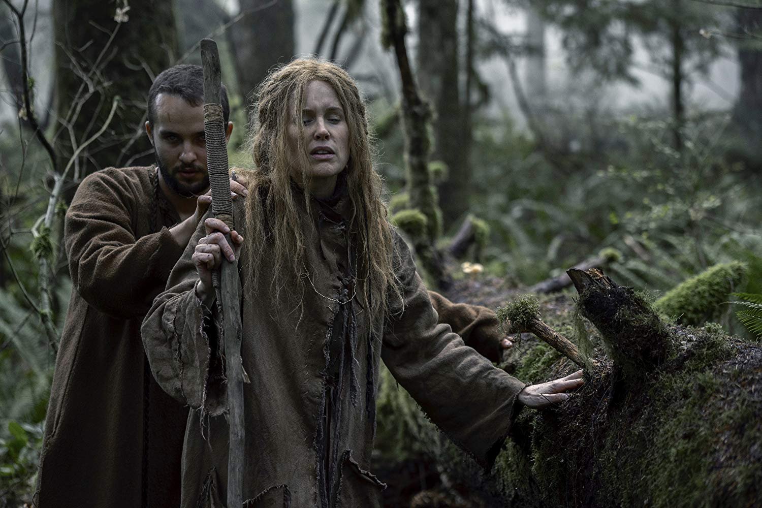 Тифлокомментарий: цветной кадр из сериала. Женщина средних лет ведет молодого мужчину через лес. У нее спутанные длинные волосы, она идет, одной рукой опираясь о посох, другой касаясь огромного поваленного ствола дерева. Ее глаза закрыты. Мужчина за спиной женщины положил правую руку ей на плечо, пальцами левой он ведет по тому же стволу.