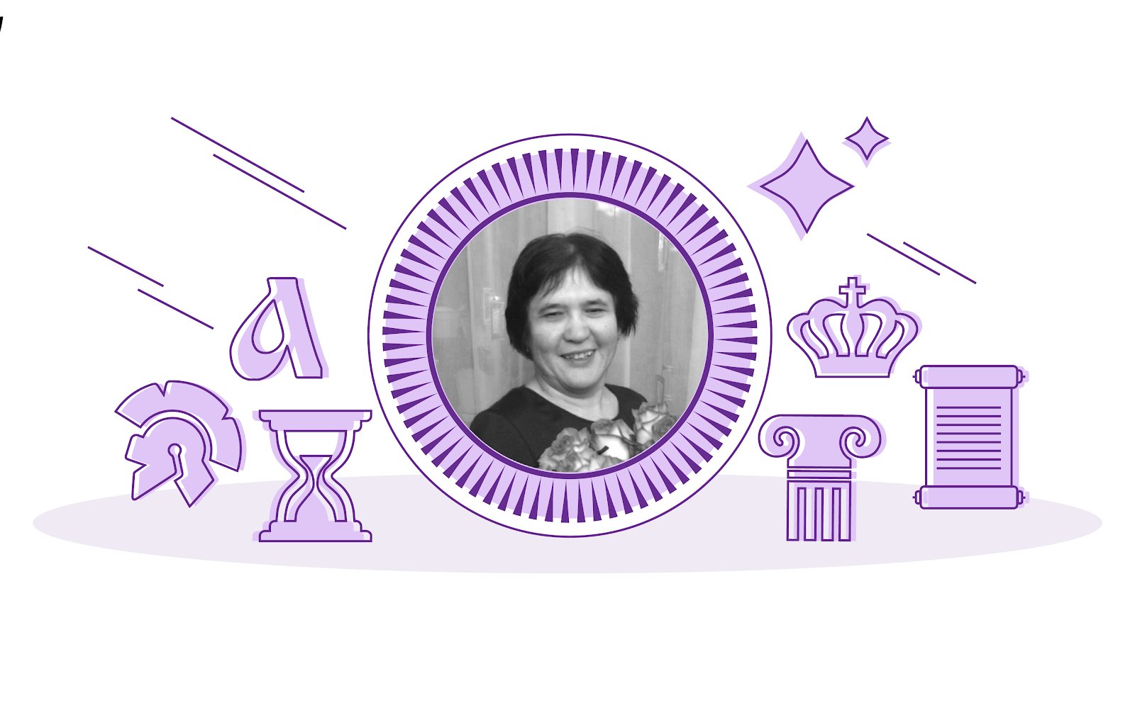 Тифлокомментарий: иллюстрации к статье выдержаны в одном стиле: черно-белая фотография в круглой розовой зубчатой рамке и розовые иконки на светлом фоне по обе стороны от фото. На первой фотографии Танзиля Абдулова — женщина средних лет с короткой стрижкой, крупными чертами лица; глаза ее прищурены, взгляд расфокусирован. Она широко улыбается. На Танзиле темная футболка, в руках она держит букет из роз. Справа и слева от фотографии — рисунки свитка, колонны, короны и буквы «а» древнерусского алфавита.