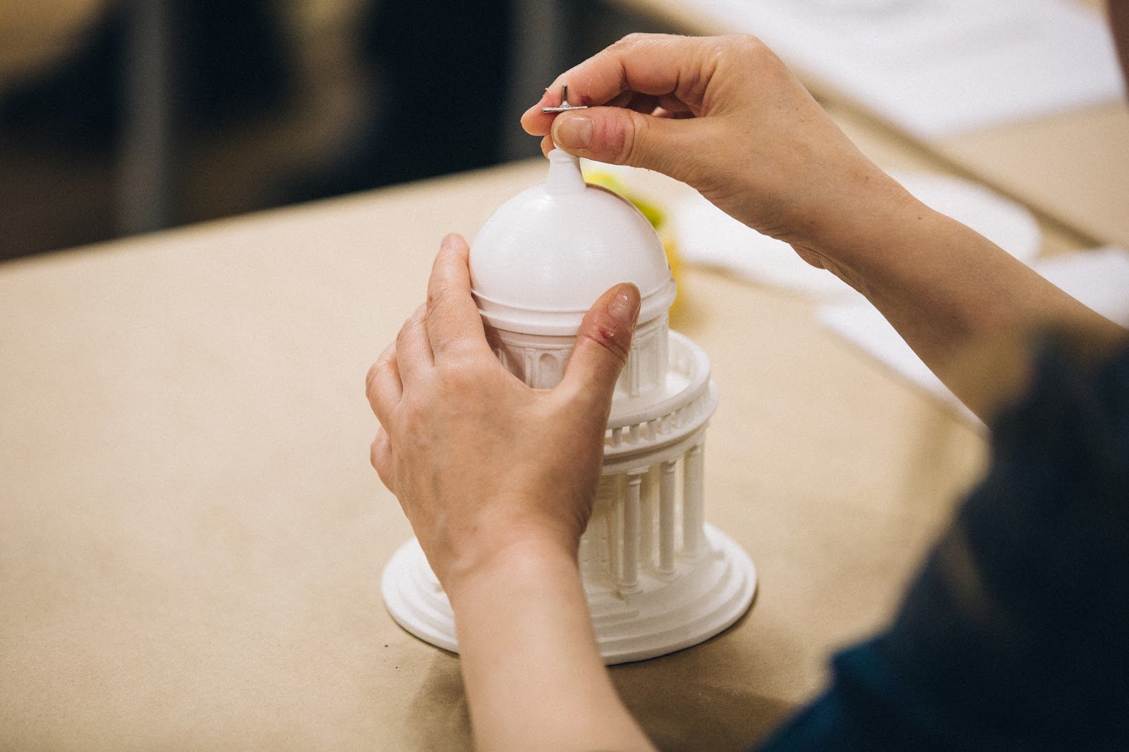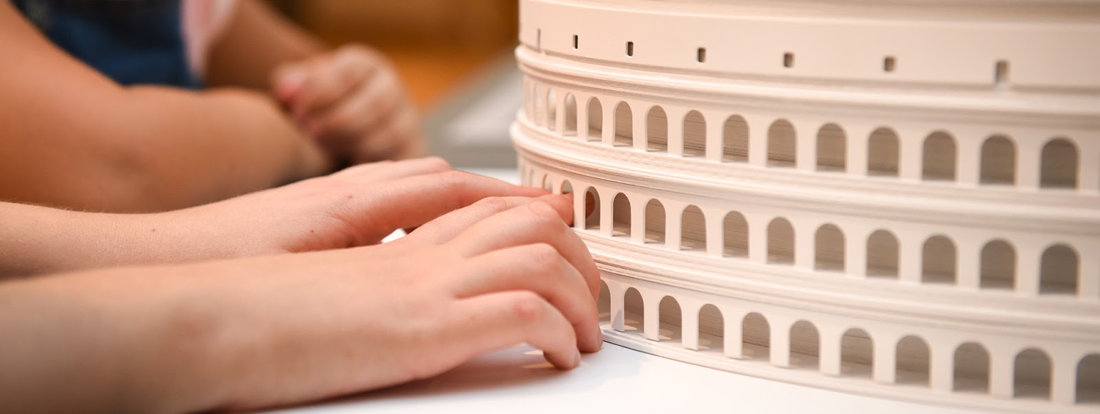 Тифлокомментарий: цветная фотография. На столе стоит тактильная модель часовни Темпьетто в Италии белого цвета. Это ротонда — круглое в основании двухуровневое сооружение на постаменте с круглым куполом и крестом на вершине . На первом ярусе по окружности ротонды расположены колонны. Второй ярус пронизан нишами, а перила по всей окружности образуют балкон, который опирается на колоннаду. Макет осматривает руками человек, пальцы правой руки трогают крест на вершине башни, левая лежит на куполе.