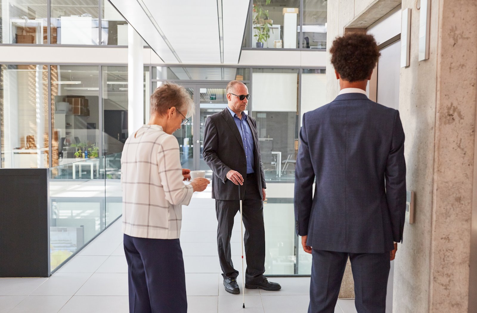 Тифлокомментарий: цветная фотография. В холле просторного офисного здания перед лифтом стоят три человека, одетые в деловом стиле: два мужчины и женщина. Мужчина средних лет в темных очках держит в правой руке белую трость. Женщина, опустив голову, смотрит на чашку с блюдцем у себя в руках. Молодой мужчина стоит у кнопок лифта.