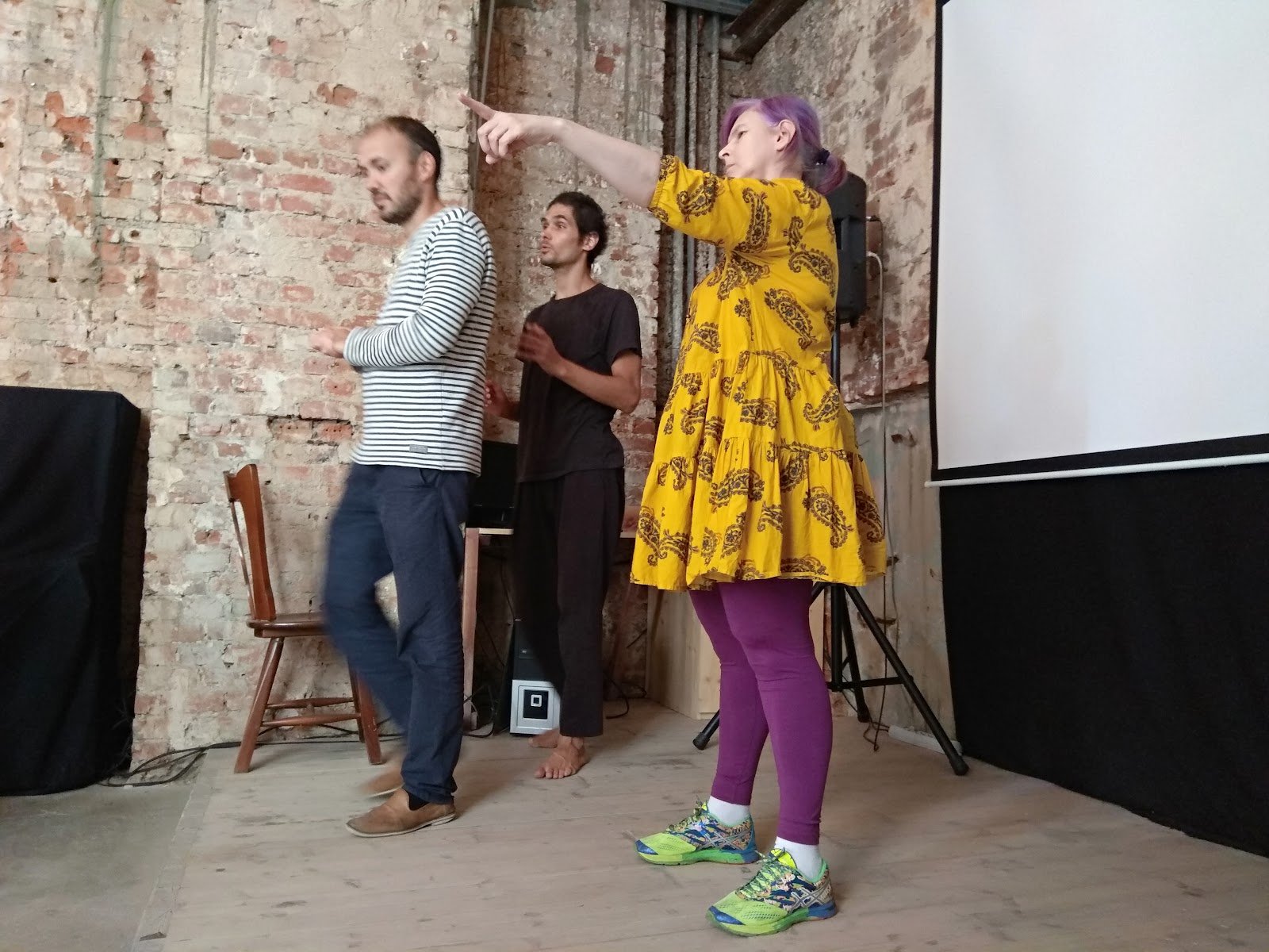 Тифлокомментарий: цветная фотография. Туфан, Марсель и Ирина в репетиционном зале с кирпичными стенами. Марсель в черных трико и футболке стоит босиком в углу, что-то рассказывает слушателям. Туфан в тельняшке, синих брюках и коричневых ботинках делает шаг. Ирина в желтой тунике, фиолетовых легинсах и зеленых кроссовках стоит лицом к залу, расставив ноги на ширине плеч. Поднимает левую руку перед собой, выставляет указательный палец. За ними стоит колонка на треноге, висит белый экран для проектора.